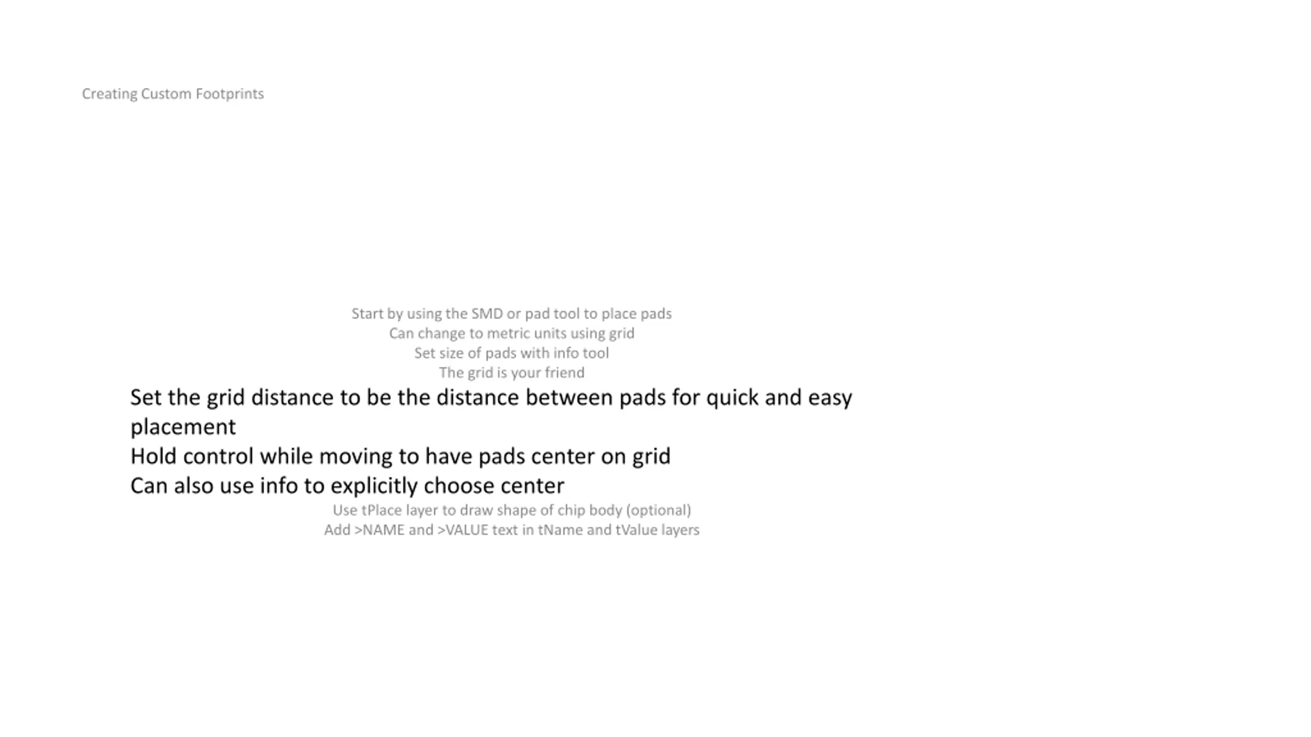 Creating Custom Footprints Start by using the SMD or pad tool to place pads Can change to metric units using grid Set size of pads with info tool The grid is your friend Set the grid distance to be the distance between pads for quick and easy placement Hold control while moving to have pads center on grid Can also use info to explicitly choose center Use tPlace layer to draw shape of chip body (optional) Add >NAME and >VALUE text in tName and tValue layers