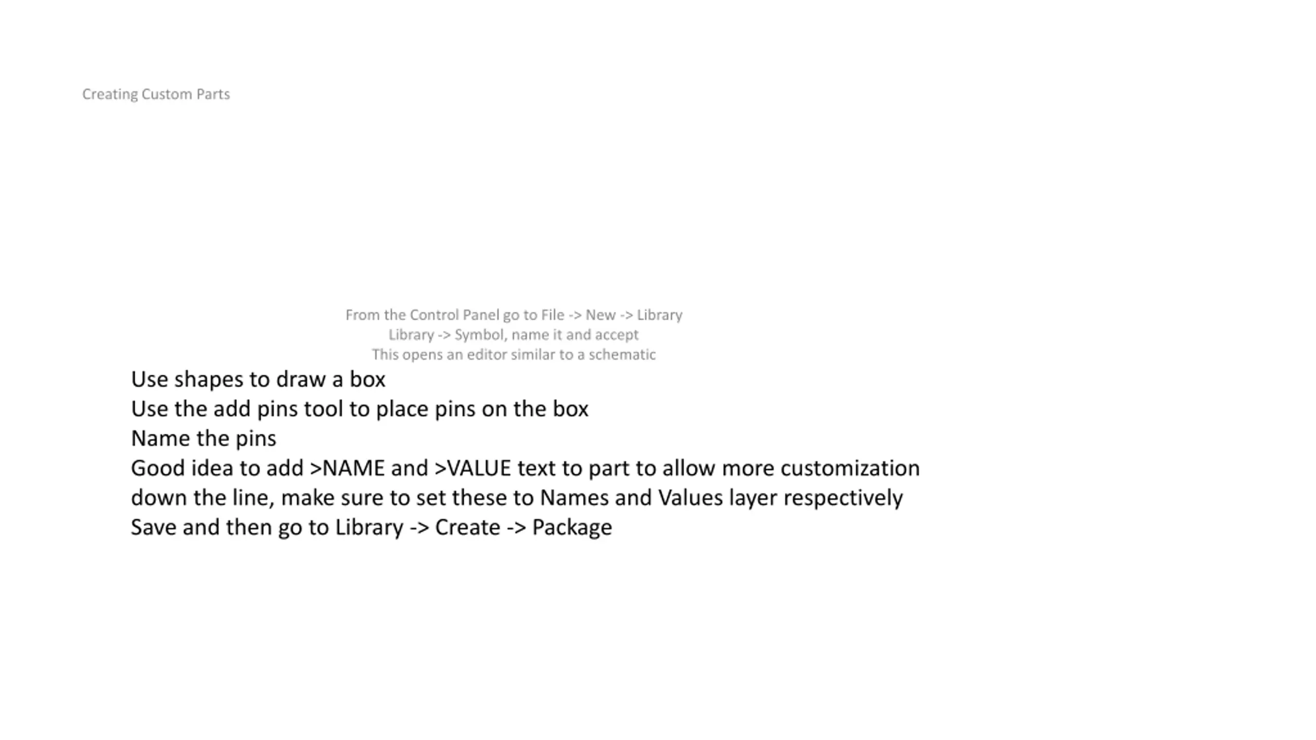 Creating Custom Parts From the Control Panel go to File -> New -> Library Library -> Symbol, name it and accept This opens an editor similar to a schematic Use shapes to draw a box Use the add pins tool to place pins on the box Name the pins Good idea to add >NAME and >VALUE text to part to allow more customization down the line, make sure to set these to Names and Values layer respectively Save and then go to Library -> Create -> Package