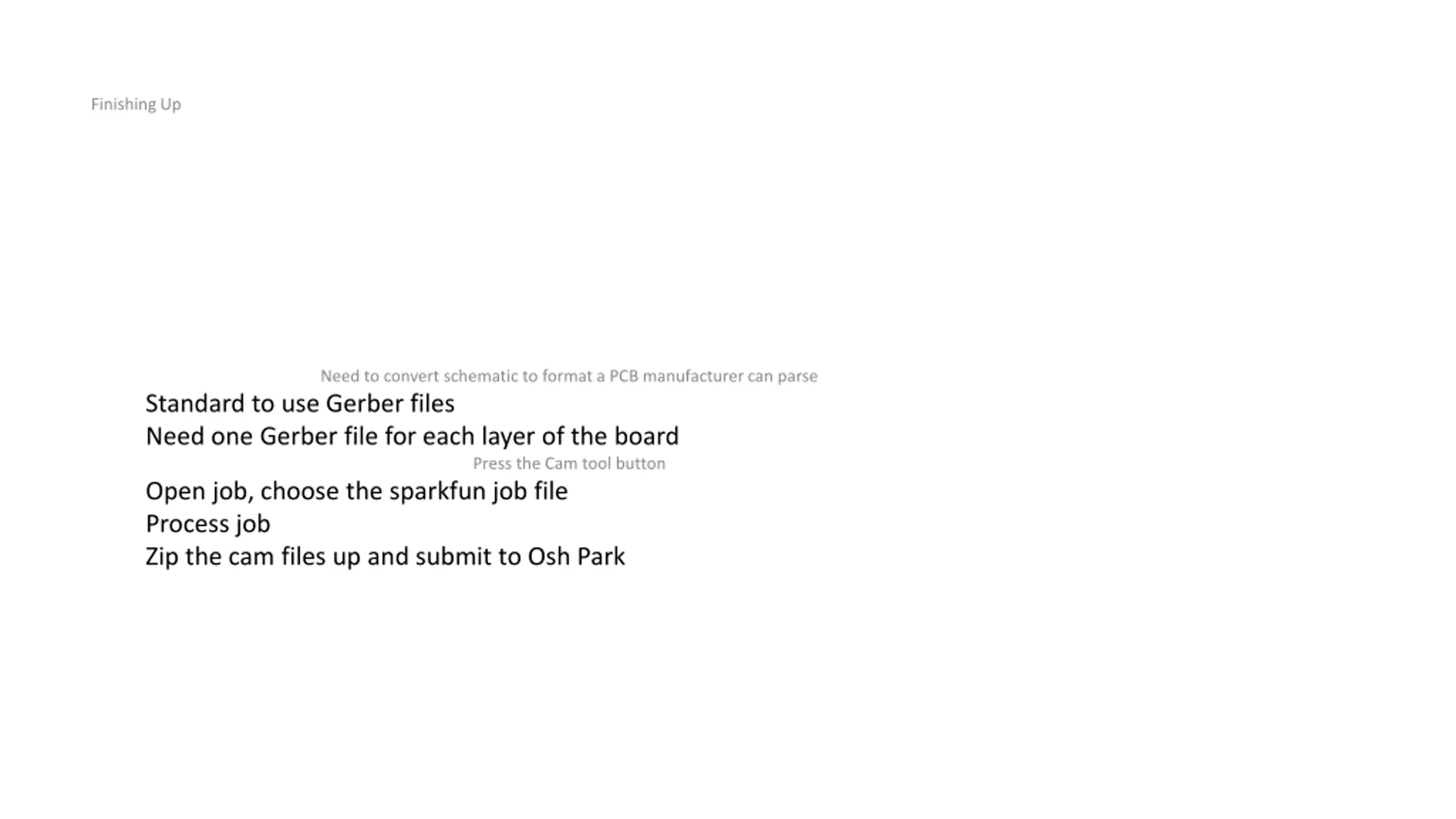 Finishing Up Need to convert schematic to format a PCB manufacturer can parse Standard to use Gerber files Need one Gerber file for each layer of the board Press the Cam tool button Open job, choose the sparkfun job file Process job Zip the cam files up and submit to Osh Park