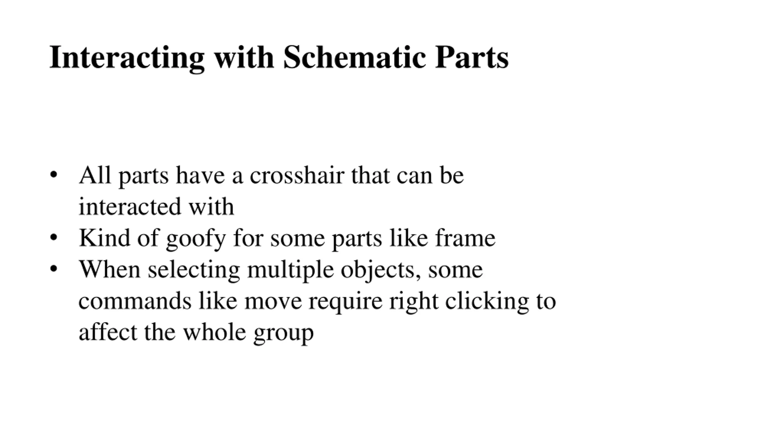 Interacting with Schematic Parts All parts have a crosshair that can be interacted with Kind of goofy for some parts like frame When selecting multiple objects, some commands like move require right clicking to affect the whole group