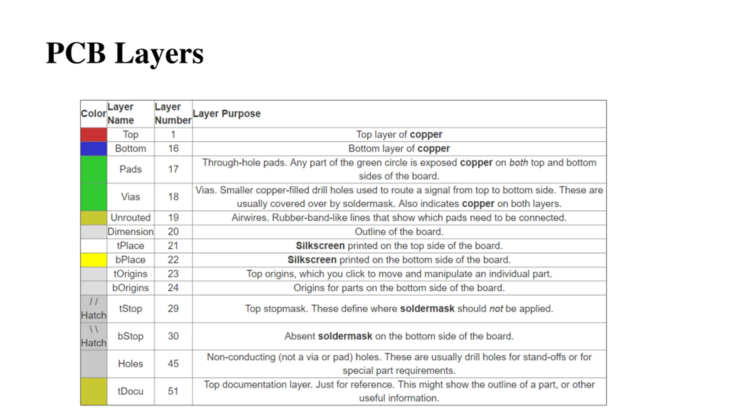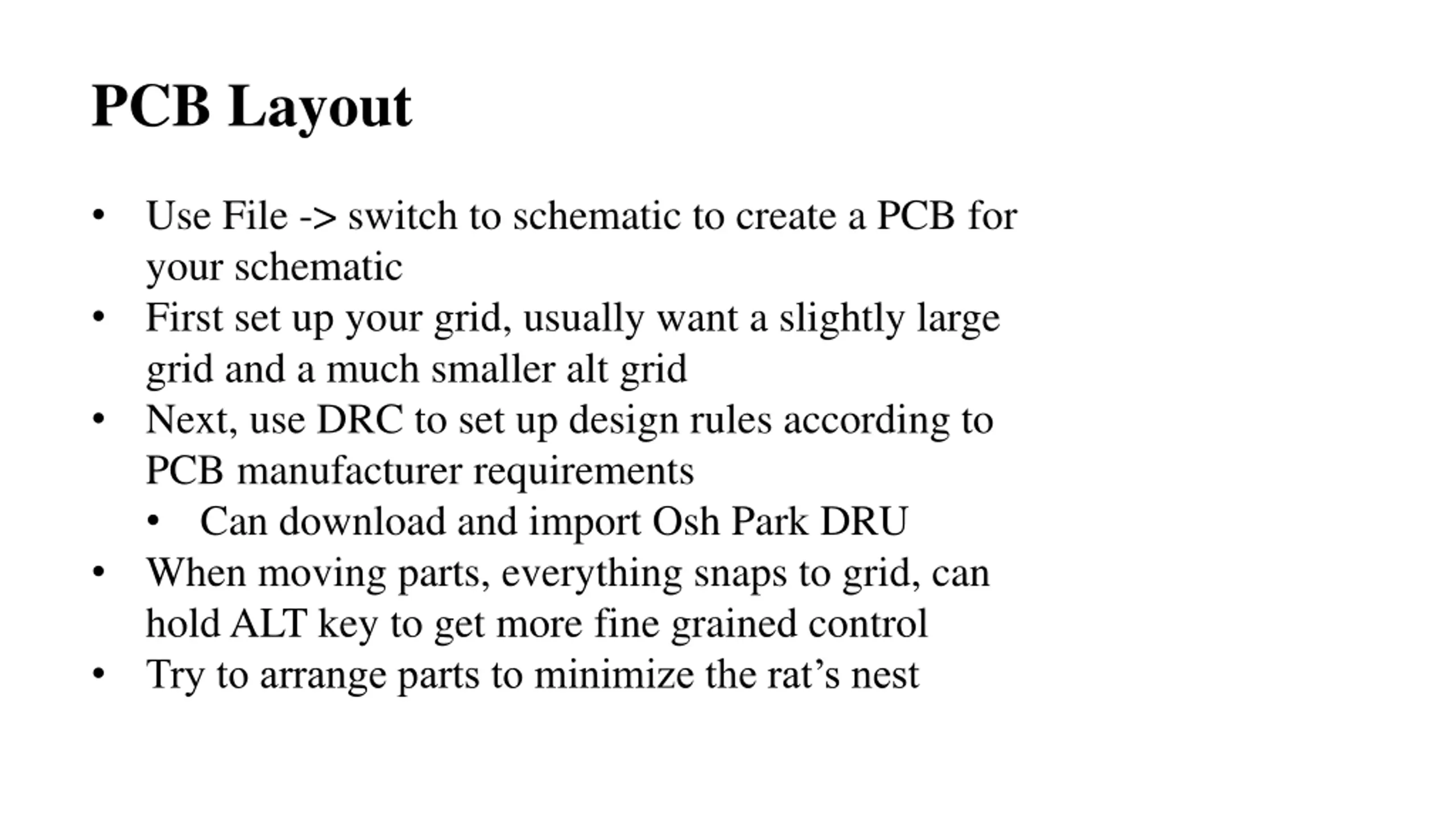 PCB Layout Use File -> switch to schematic to create a PCB for your schematic First set up your grid, usually want a slightly large grid and a much smaller alt grid Next, use DRC to set up design rules according to PCB manufacturer requirements Can download and import Osh Park DRU When moving parts, everything snaps to grid, can hold ALT key to get more fine grained control Try to arrange parts to minimize the rat s nest