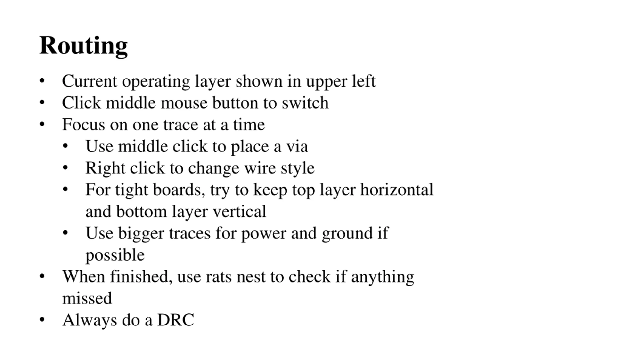 Routing Current operating layer shown in upper left Click middle mouse button to switch Focus on one trace at a time Use middle click to place a via Right click to change wire style For tight boards, try to keep top layer horizontal and bottom layer vertical Use bigger traces for power and ground if possible When finished, use rats nest to check if anything missed Always do a DRC