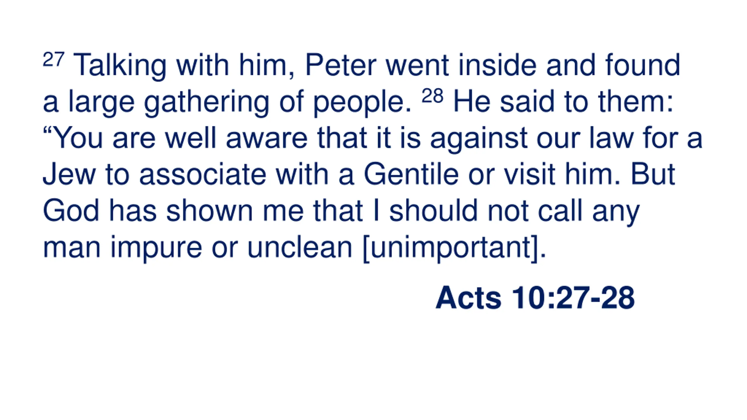 27 Talking with him, Peter went inside and found a large gathering of people. 28 He said to them: You are well aware that it is against our law for a Jew to associate with a Gentile or visit him. But God has shown me that I should not call any man impure or unclean [unimportant]. Acts 10:27-28