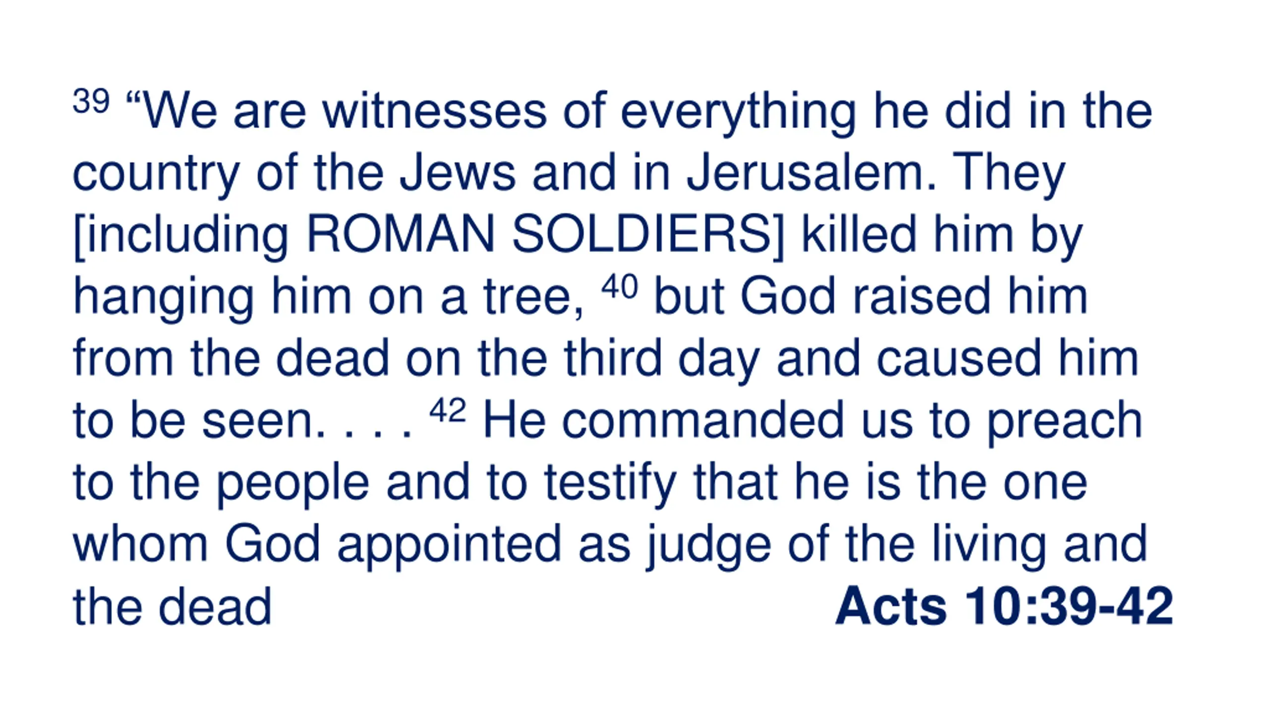 39We are witnesses of everything he did in the country of the Jews and in Jerusalem. They [including ROMAN SOLDIERS] killed him by hanging him on a tree, 40 but God raised him from the dead on the third day and caused him to be seen. . . . 42 He commanded us to preach to the people and to testify that he is the one whom God appointed as judge of the living and the dead Acts 10:39-42