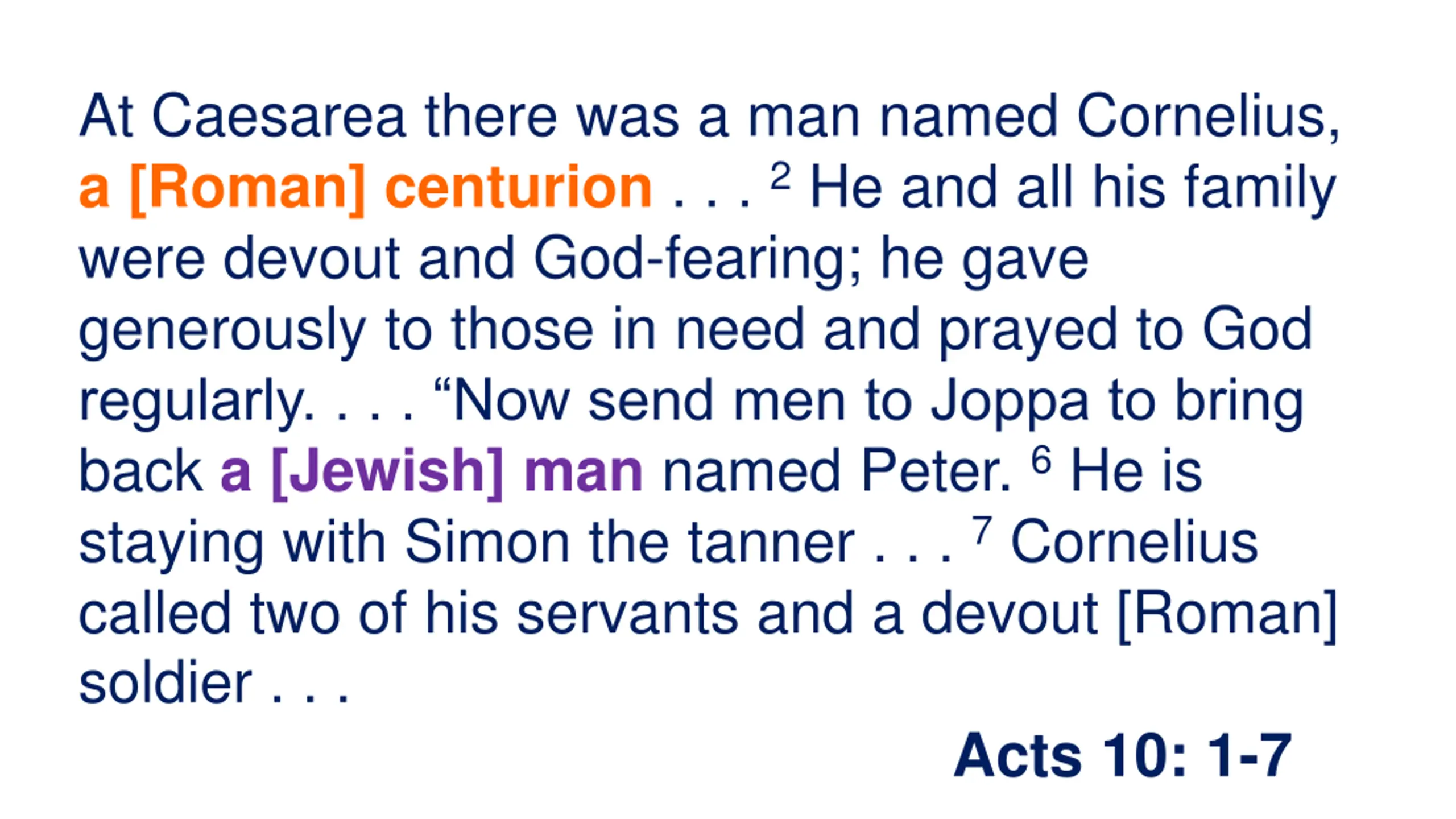 At Caesarea there was a man named Cornelius, a [Roman] centurion . . . 2 He and all his family were devout and God-fearing; he gave generously to those in need and prayed to God regularly. . . . Now send men to Joppa to bring back a [Jewish] man named Peter. 6 He is staying with Simon the tanner . . . 7 Cornelius called two of his servants and a devout [Roman] soldier . . . Acts 10: 1-7