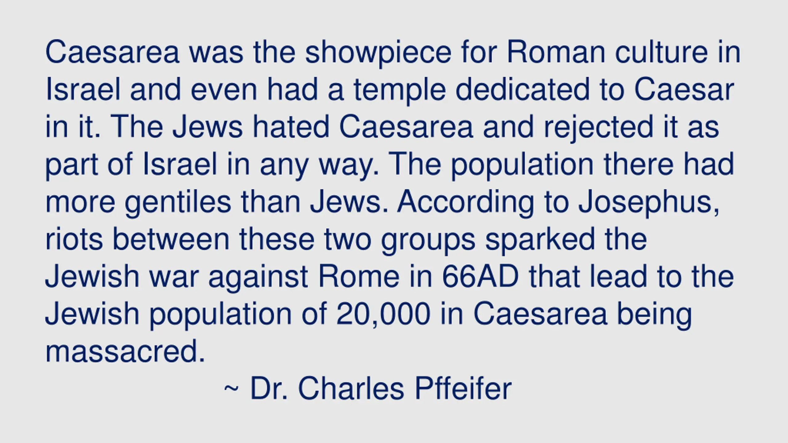 Caesarea was the showpiece for Roman culture in Israel and even had a temple dedicated to Caesar in it. The Jews hated Caesarea and rejected it as part of Israel in any way. The population there had more gentiles than Jews. According to Josephus, riots between these two groups sparked the Jewish war against Rome in 66AD that lead to the Jewish population of 20,000 in Caesarea being massacred. ~ Dr. Charles Pffeifer