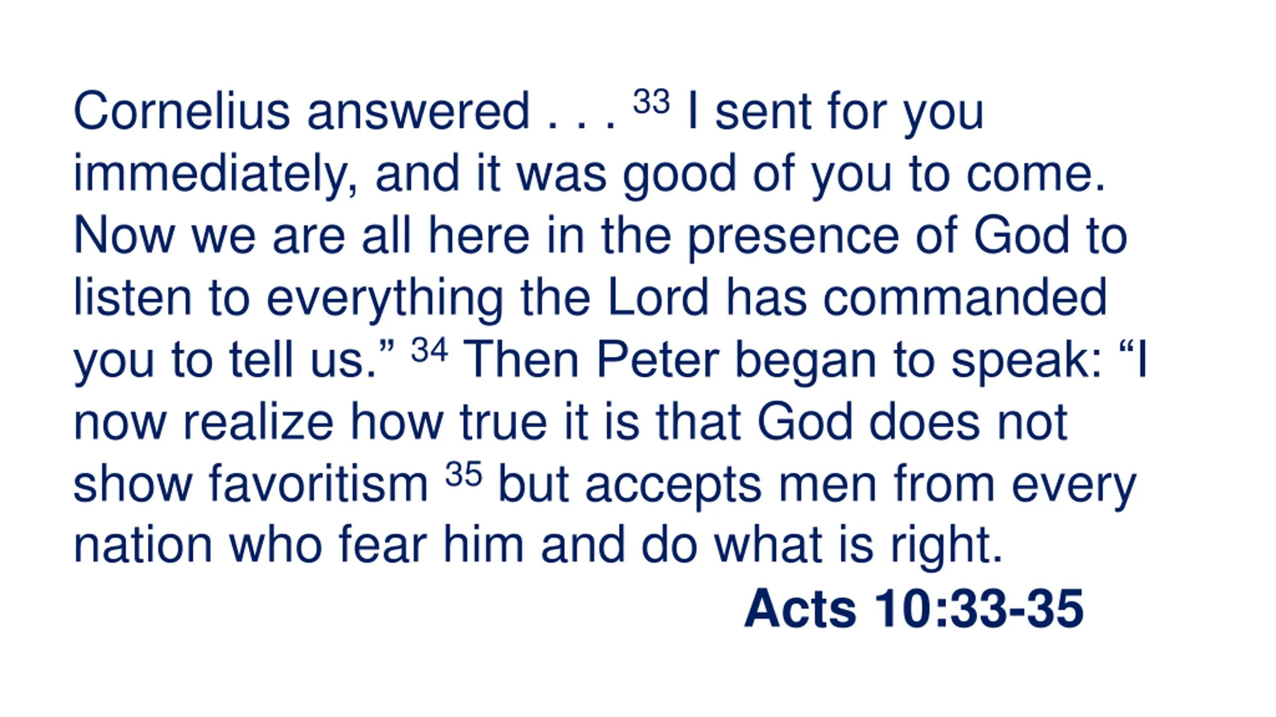 Cornelius answered . . . 33 I sent for you immediately, and it was good of you to come. Now we are all here in the presence of God to listen to everything the Lord has commanded you to tell us. 34Then Peter began to speak: I now realize how true it is that God does not show favoritism 35 but accepts men from every nation who fear him and do what is right. Acts 10:33-35