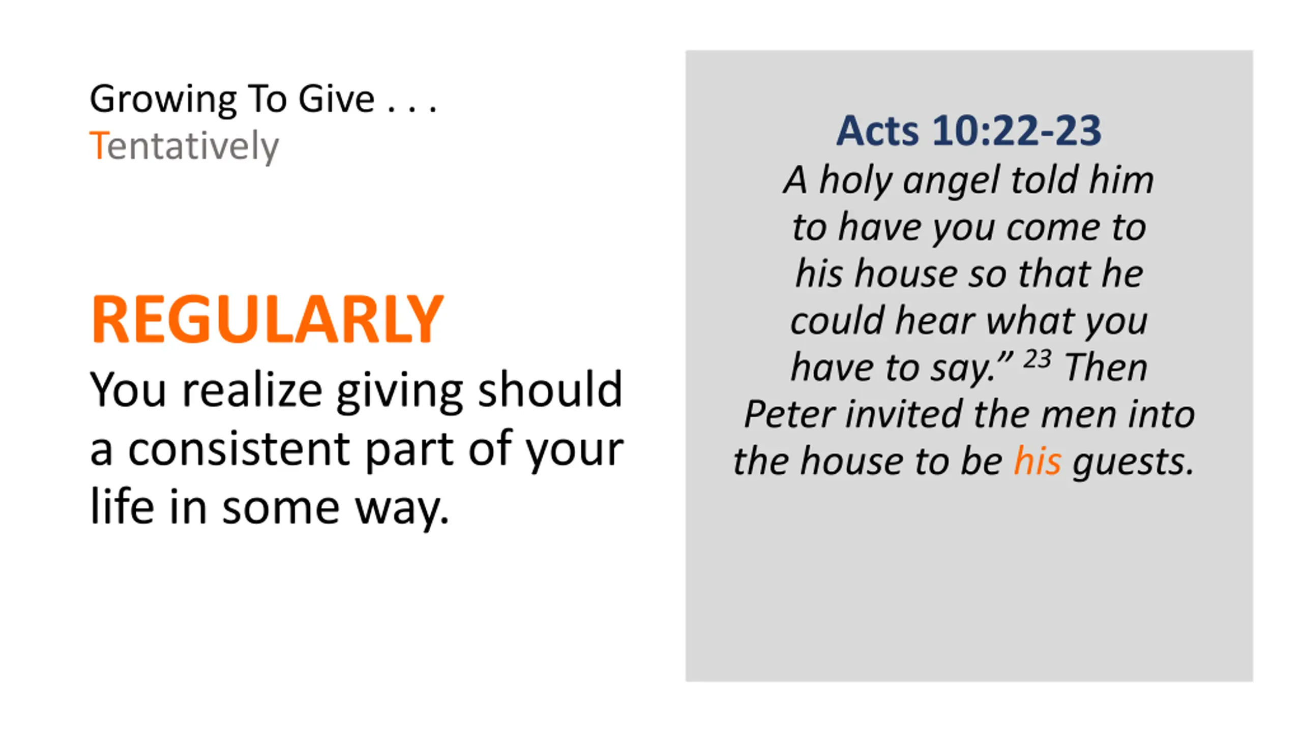 Growing To Give . . . Tentatively Acts 10:22-23 A holy angel told him to have you come to his house so that he could hear what you have to say. 23 Then Peter invited the men into the house to be his guests. REGULARLY You realize giving should a consistent part of your life in some way.