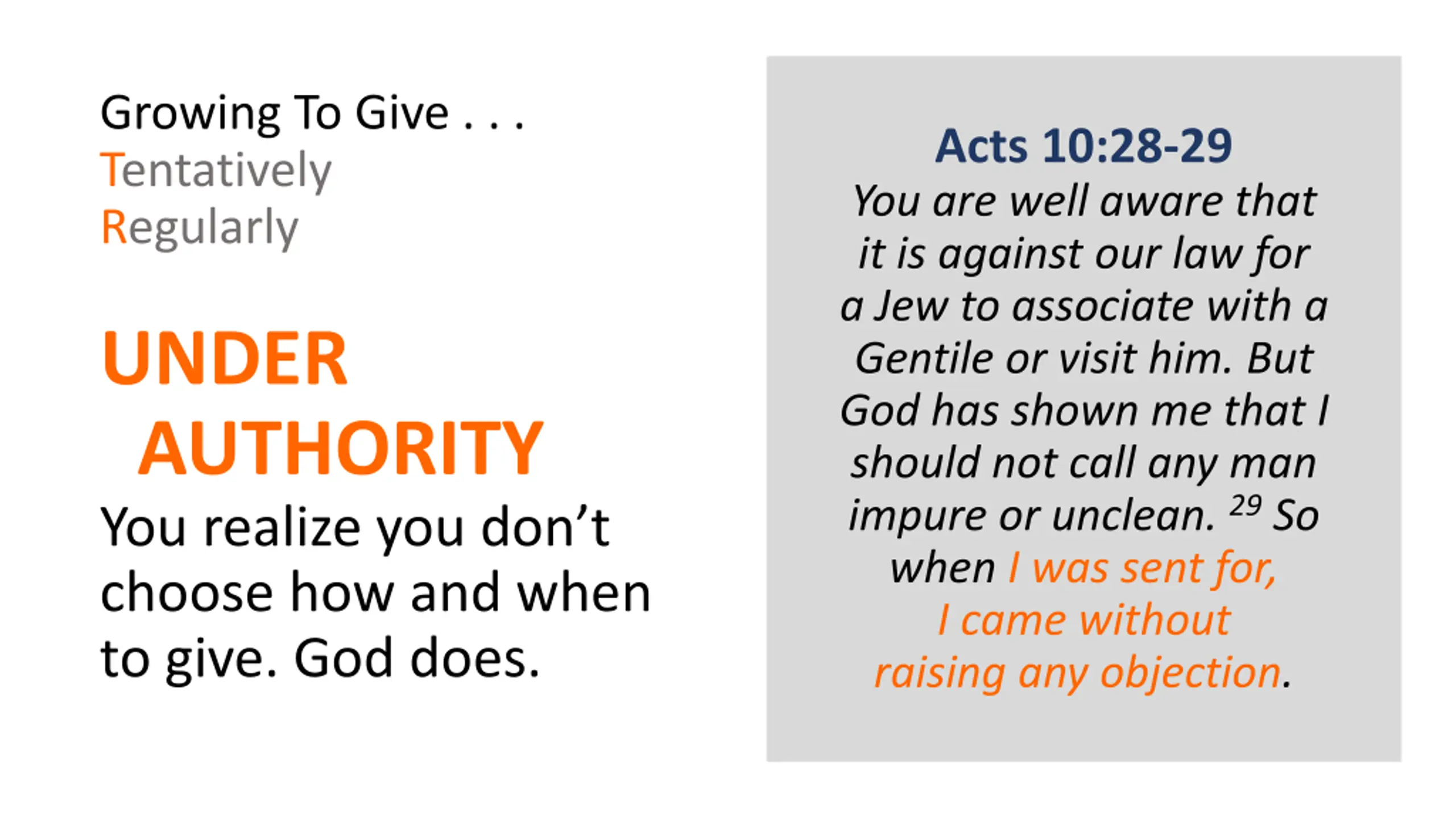 Growing To Give . . . Tentatively Regularly Acts 10:28-29 You are well aware that it is against our law for a Jew to associate with a Gentile or visit him. But God has shown me that I should not call any man impure or unclean. 29 So when I was sent for, I came without raising any objection. UNDER AUTHORITY You realize you don t choose how and when to give. God does.