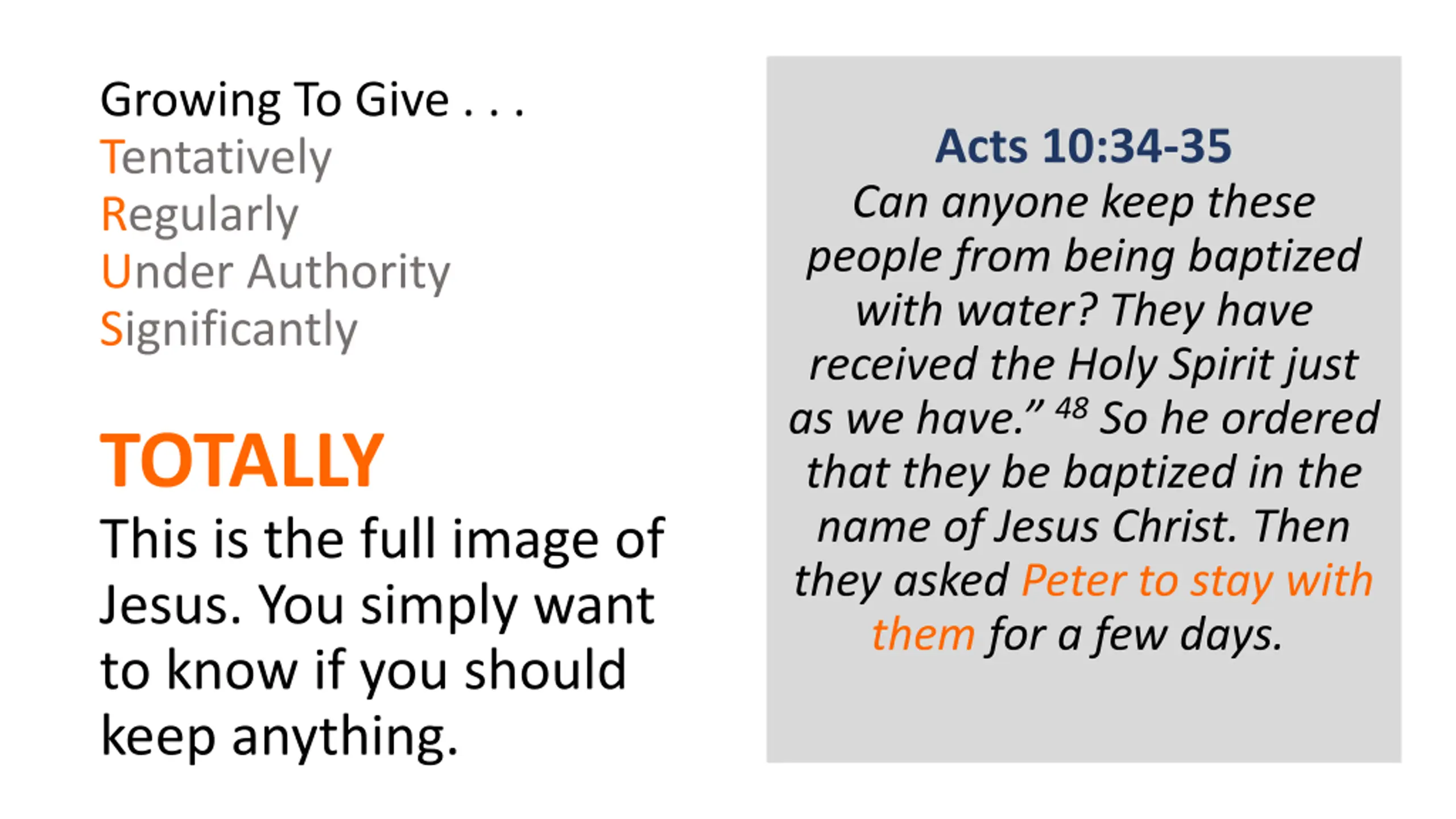 Growing To Give . . . Tentatively Regularly Under Authority Significantly Acts 10:34-35 Can anyone keep these people from being baptized with water? They have received the Holy Spirit just as we have. 48 So he ordered that they be baptized in the name of Jesus Christ. Then they asked Peter to stay with them for a few days. TOTALLY This is the full image of Jesus. You simply want to know if you should keep anything.