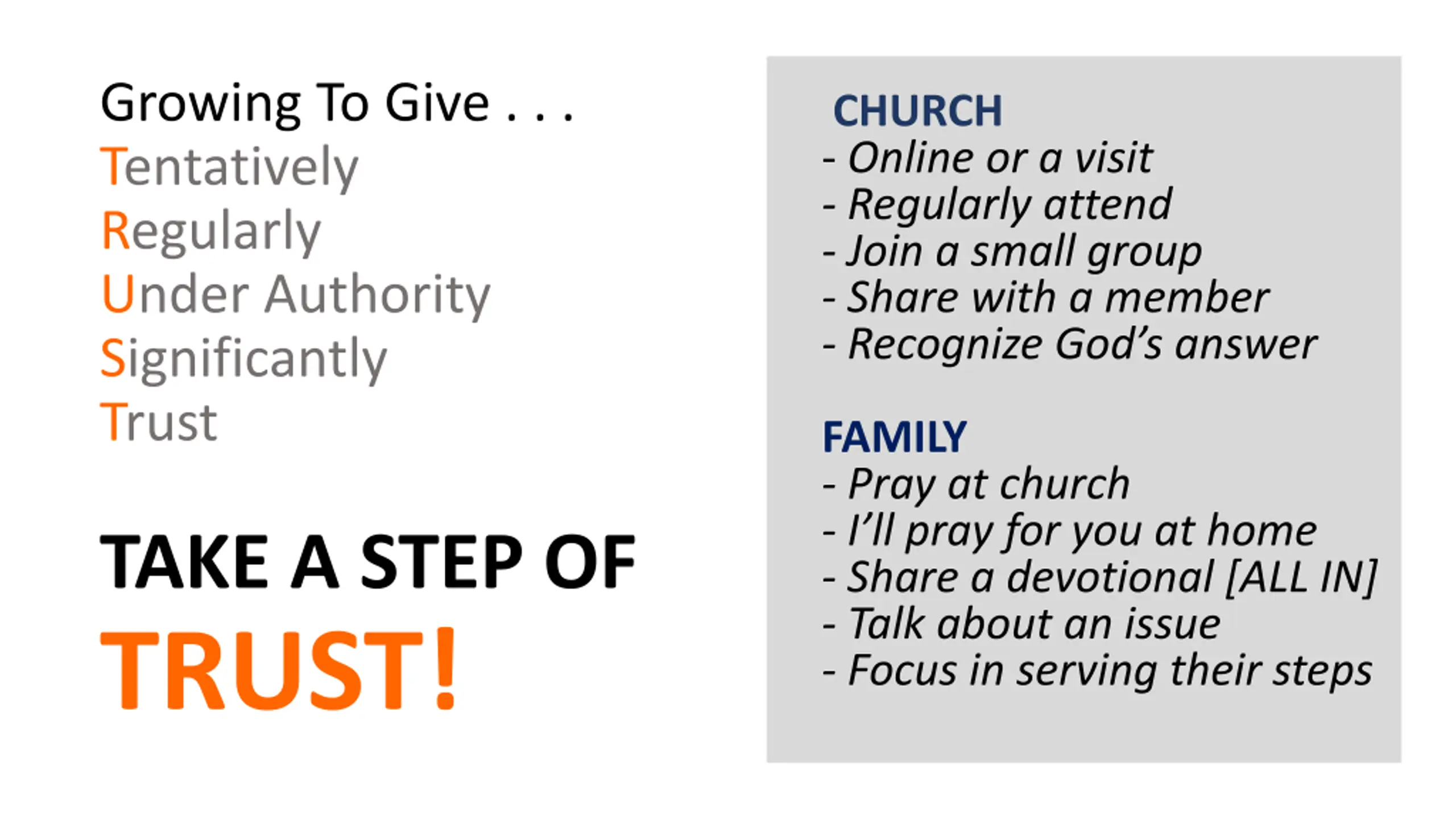 Growing To Give . . . Tentatively Regularly Under Authority Significantly Trust CHURCH - Online or a visit - Regularly attend - Join a small group - Share with a member - Recognize God s answer FAMILY - Pray at church - I ll pray for you at home - Share a devotional [ALL IN] - Talk about an issue - Focus in serving their steps TAKE A STEP OF TRUST!