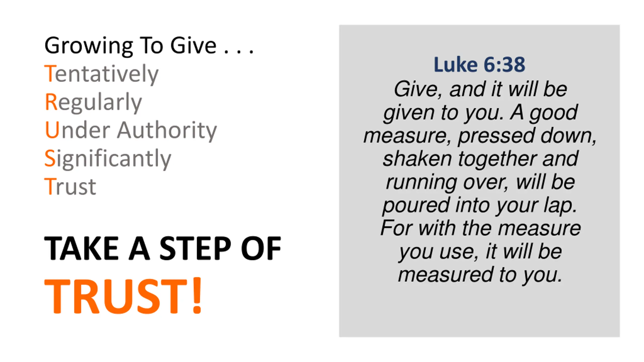 Growing To Give . . . Tentatively Regularly Under Authority Significantly Trust Luke 6:38 Give, and it will be given to you. A good measure, pressed down, shaken together and running over, will be poured into your lap. For with the measure you use, it will be measured to you. TAKE A STEP OF TRUST!