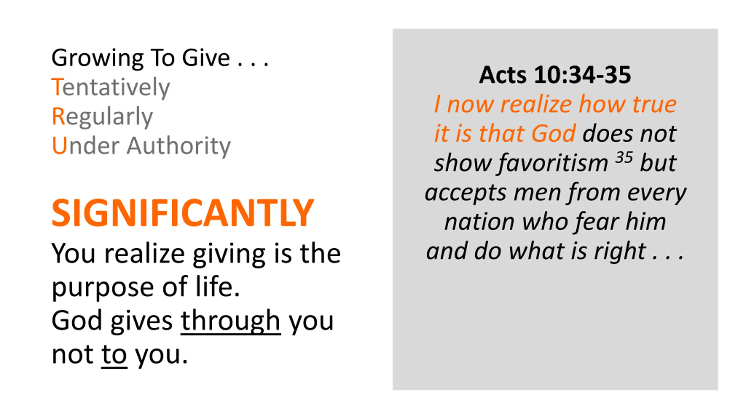 Growing To Give . . . Tentatively Regularly Under Authority Acts 10:34-35 I now realize how true it is that God does not show favoritism 35 but accepts men from every nation who fear him and do what is right . . . SIGNIFICANTLY You realize giving is the purpose of life. God gives through you not to you.