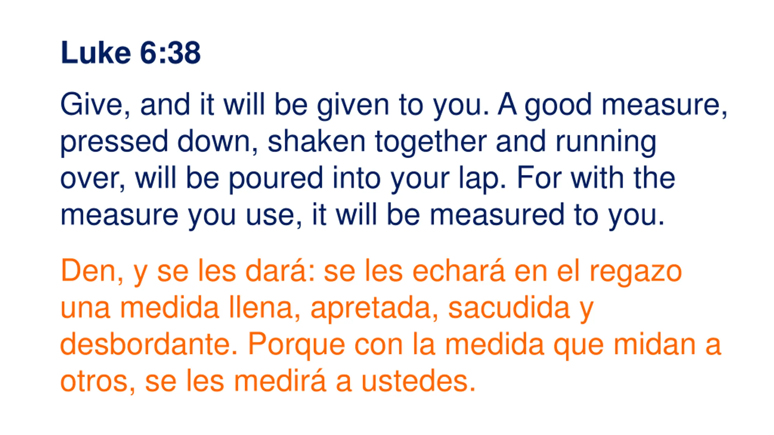 Luke 6:38 Give, and it will be given to you. A good measure, pressed down, shaken together and running over, will be poured into your lap. For with the measure you use, it will be measured to you. Den, y se les dar : se les echar en el regazo una medida llena, apretada, sacudida y desbordante. Porque con la medida que midan a otros, se les medir a ustedes.