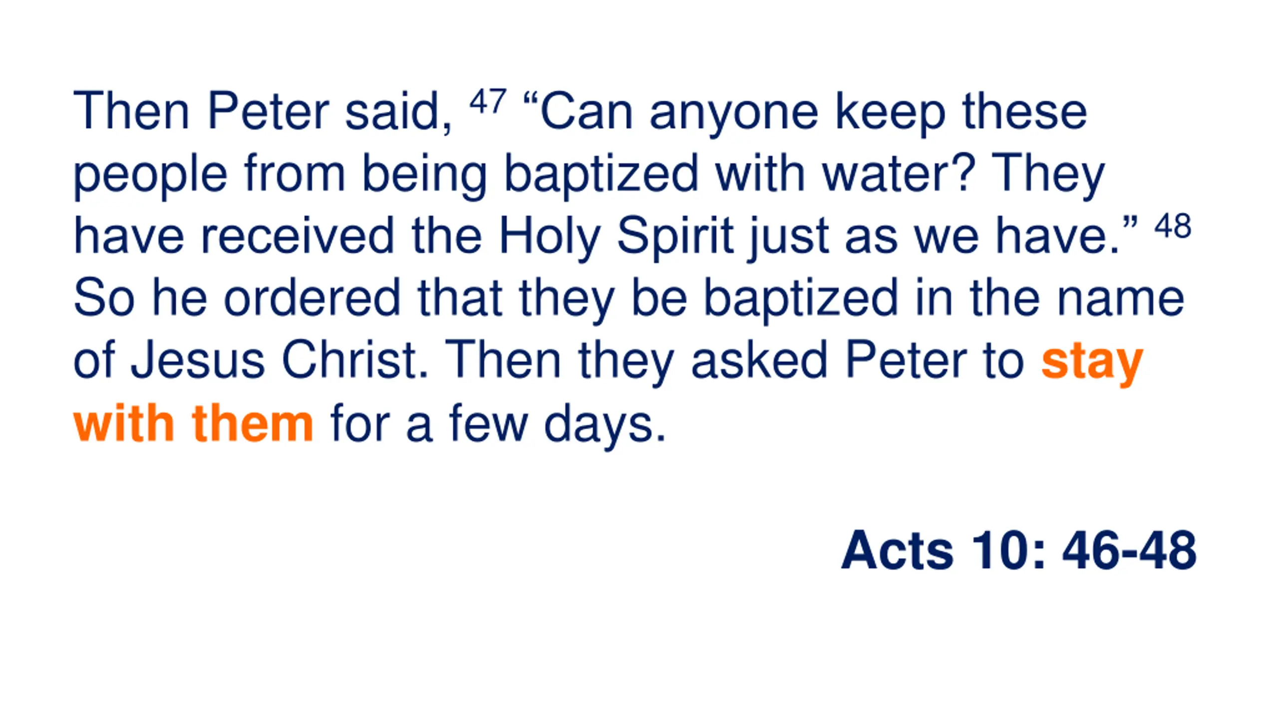 Then Peter said, 47Can anyone keep these people from being baptized with water? They have received the Holy Spirit just as we have. 48 So he ordered that they be baptized in the name of Jesus Christ. Then they asked Peter to stay with them for a few days. Acts 10: 46-48