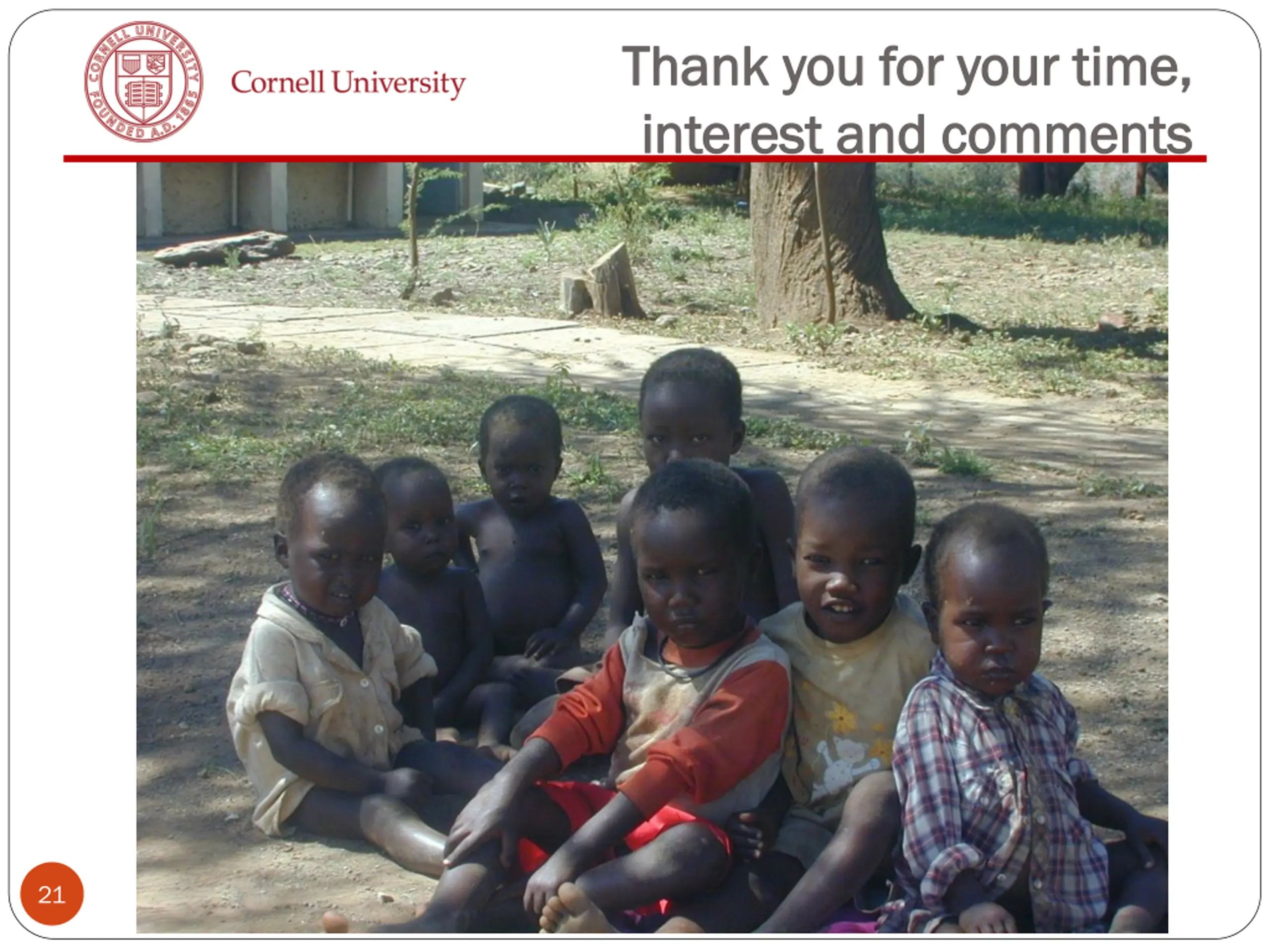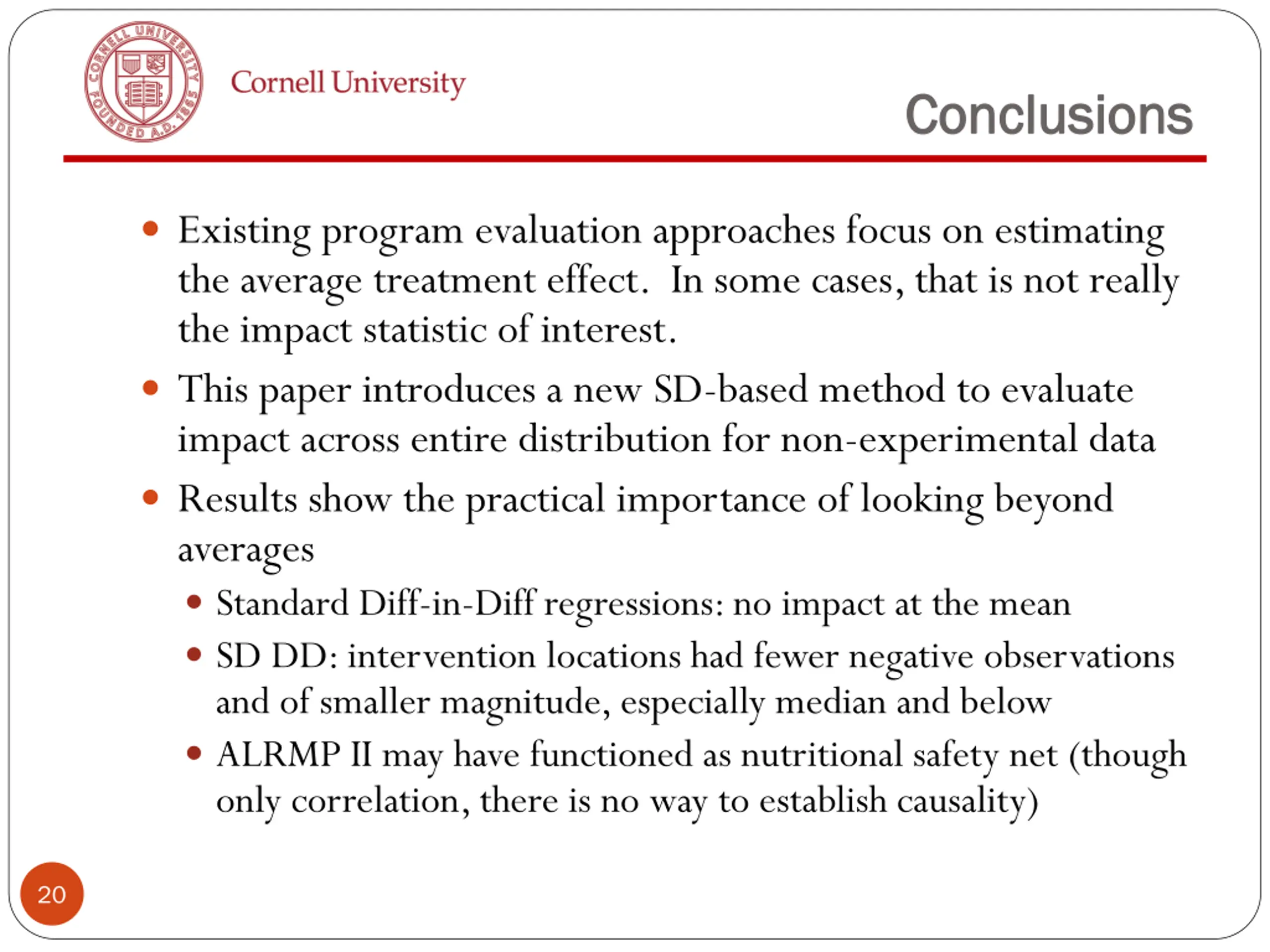 Conclusions Conclusions Existing program evaluation approaches focus on estimating the average treatment effect. In some cases, that is not really the impact statistic of interest. This paper introduces a new SD-based method to evaluate impact across entire distribution for non-experimental data Results show the practical importance of looking beyond averages Standard Diff-in-Diff regressions: no impact at the mean SD DD: intervention locations had fewer negative observations and of smaller magnitude, especially median and below ALRMP II may have functioned as nutritional safety net (though only correlation, there is no way to establish causality) 20