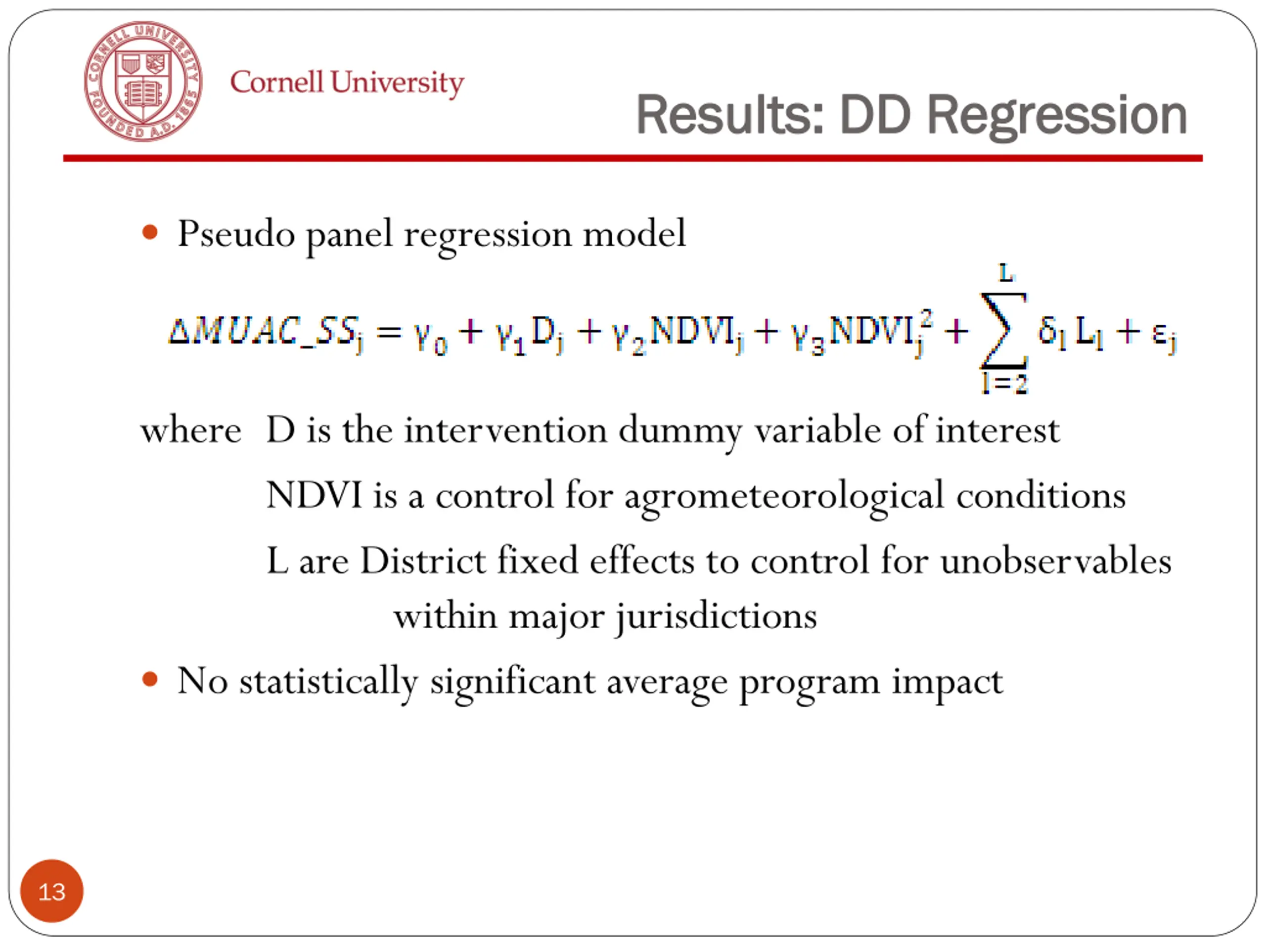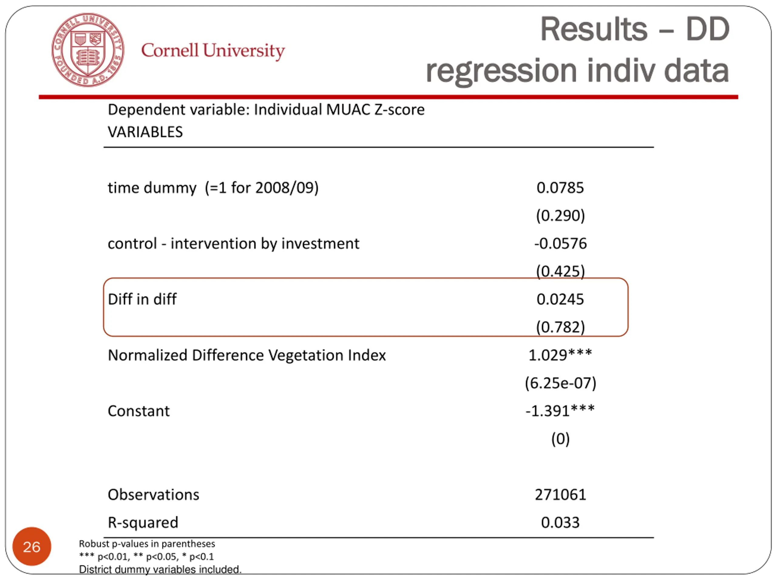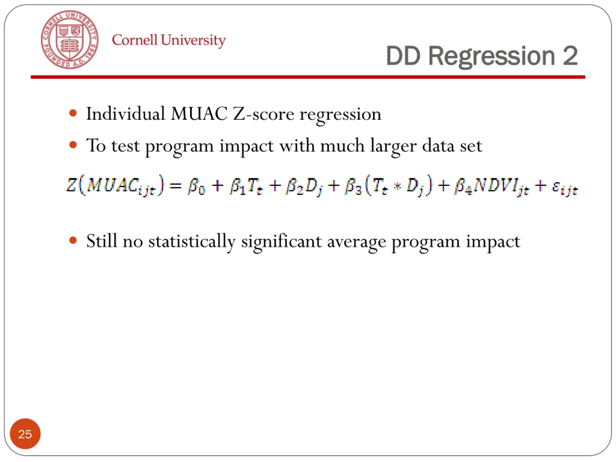 DD Regression 2 DD Regression 2 Individual MUAC Z-score regression To test program impact with much larger data set Still no statistically significant average program impact 25