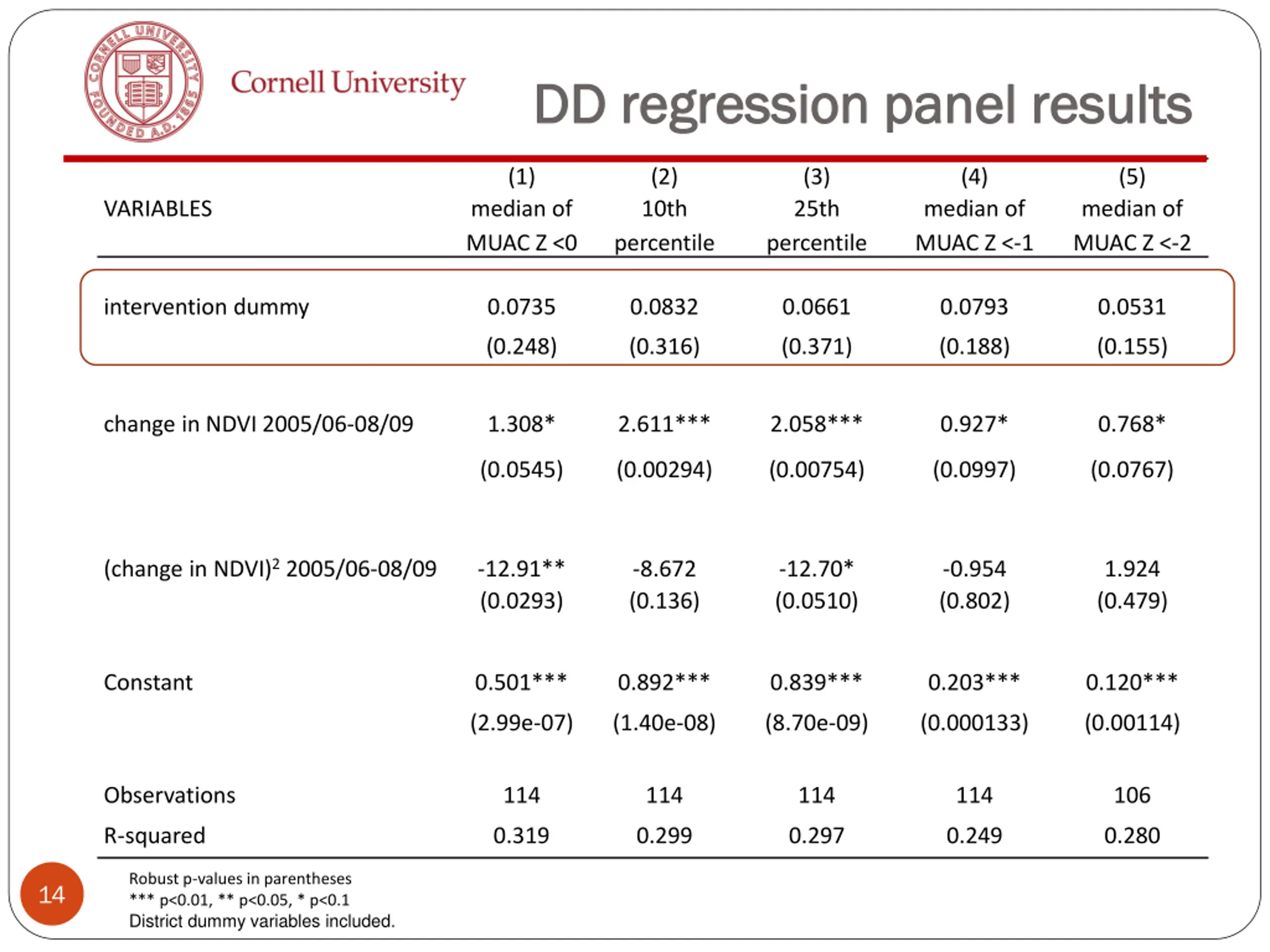 DD regression panel results DD regression panel results (1) (2) 10th (3) 25th (4) (5) VARIABLES median of MUAC Z <0 median of MUAC Z <-1 median of MUAC Z <-2 percentile percentile intervention dummy 0.0735 0.0832 0.0661 0.0793 0.0531 (0.248) (0.316) (0.371) (0.188) (0.155) change in NDVI 2005/06-08/09 1.308* 2.611*** 2.058*** 0.927* 0.768* (0.0545) (0.00294) (0.00754) (0.0997) (0.0767) (change in NDVI)2 2005/06-08/09 -12.91** (0.0293) -8.672 (0.136) -12.70* (0.0510) -0.954 (0.802) 1.924 (0.479) Constant 0.501*** 0.892*** 0.839*** 0.203*** 0.120*** (2.99e-07) (1.40e-08) (8.70e-09) (0.000133) (0.00114) Observations 114 114 114 114 106 R-squared 0.319 0.299 0.297 0.249 0.280 Robust p-values in parentheses *** p<0.01, ** p<0.05, * p<0.1 District dummy variables included. 14