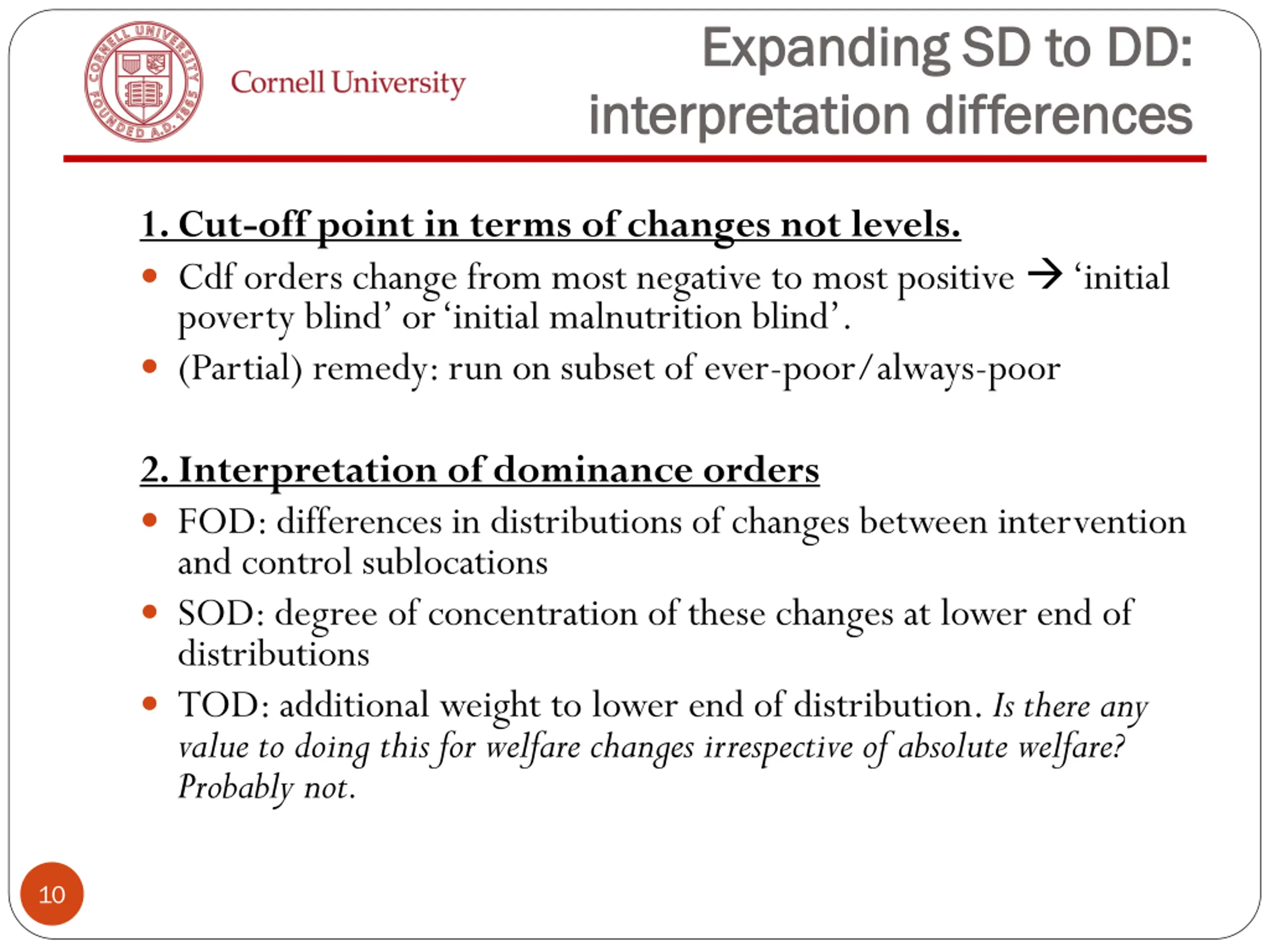 Expanding SD to DD: Expanding SD to DD: interpretation differences interpretation differences 1. Cut-off point in terms of changes not levels. Cdf orders change from most negative to most positive initial poverty blind or initial malnutrition blind . (Partial) remedy: run on subset of ever-poor/always-poor 2. Interpretation of dominance orders FOD: differences in distributions of changes between intervention and control sublocations SOD: degree of concentration of these changes at lower end of distributions TOD: additional weight to lower end of distribution. Is there any value to doing this for welfare changes irrespective of absolute welfare? Probably not. 10
