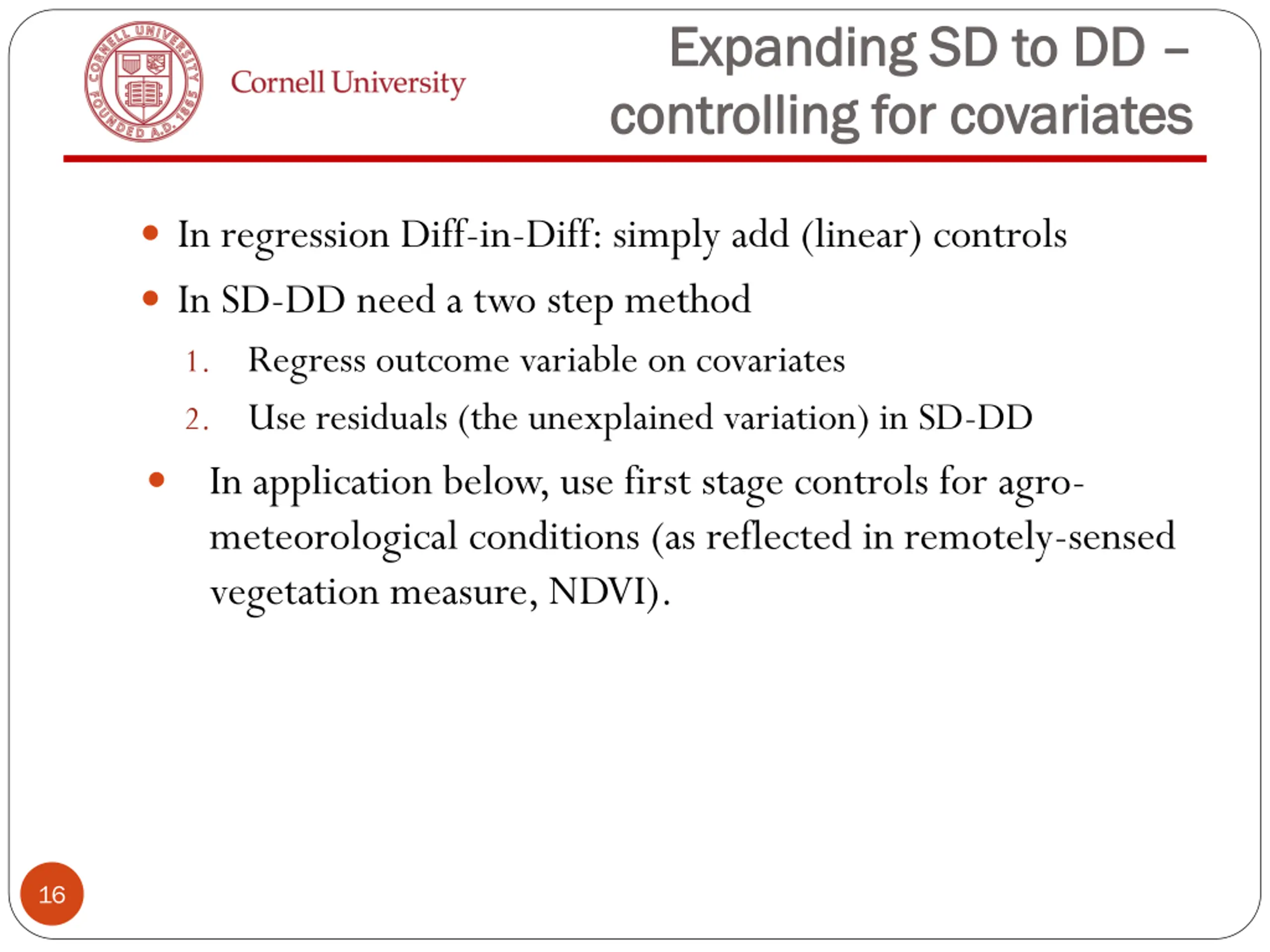 Expanding SD to DD Expanding SD to DD controlling for covariates controlling for covariates In regression Diff-in-Diff: simply add (linear) controls In SD-DD need a two step method 1. Regress outcome variable on covariates 2. Use residuals (the unexplained variation) in SD-DD In application below, use first stage controls for agro- meteorological conditions (as reflected in remotely-sensed vegetation measure, NDVI). 16
