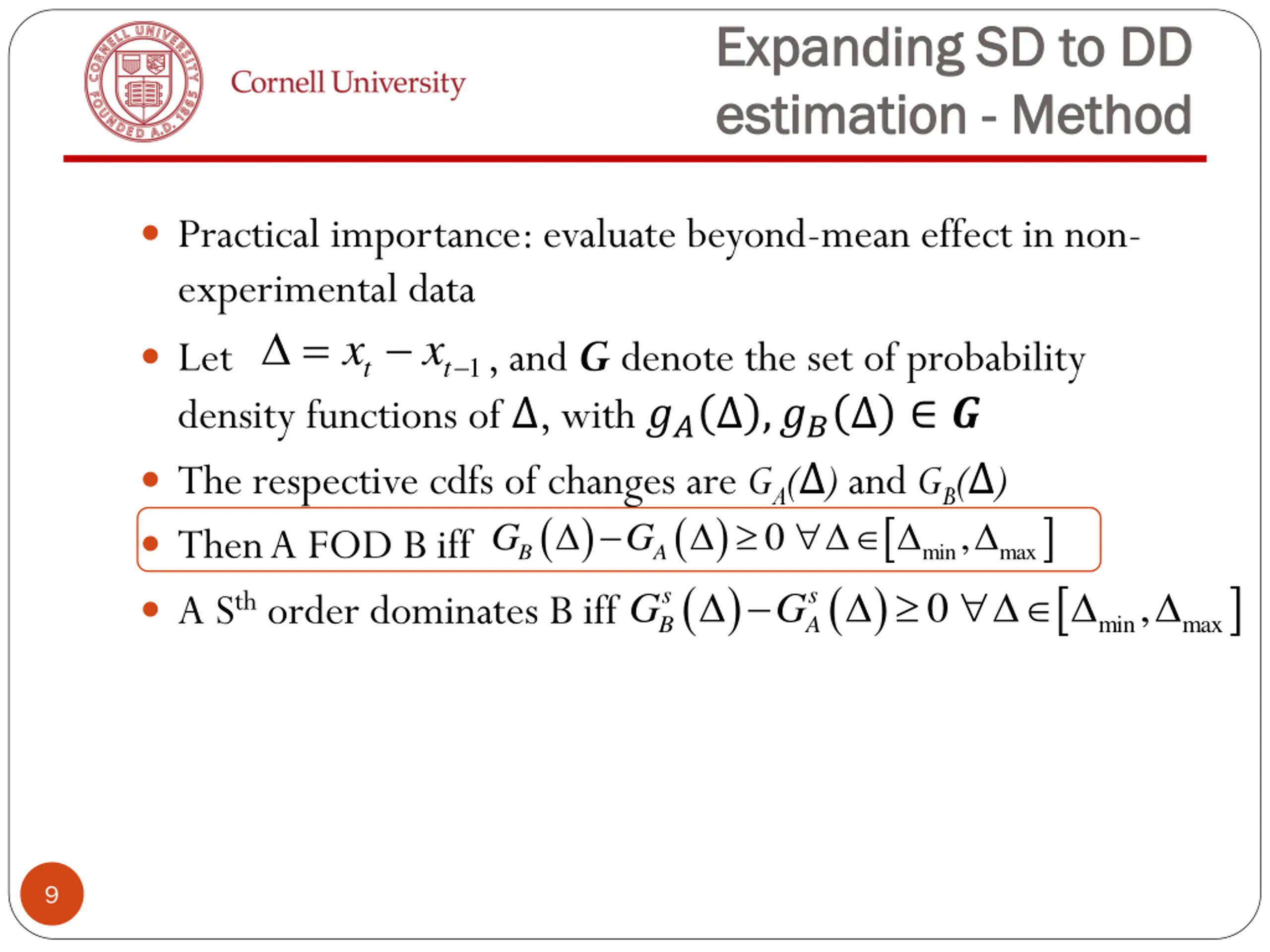 Expanding SD to DD Expanding SD to DD estimation estimation - - Method Method Practical importance: evaluate beyond-mean effect in non- experimental data Let , and G denote the set of probability density functions of , with ?? ,?? ? The respective cdfs of changes are GA( ) and GB( ) Then A FOD B iff A Sth order dominates B iff G = x x 1 t t ( ) ( ) ( ) ( ) A G 0 , G G min 0 max B A s B s , min max 9