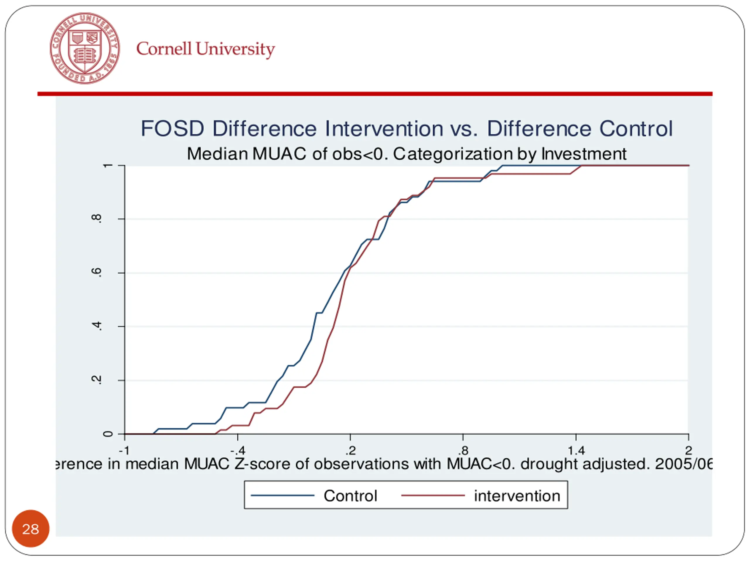 FOSD Difference Intervention vs. Difference Control Median MUAC of obs<0. Categorization by Investment 1 .8 % of sublocations .6 .4 .2 0 -1 -.4 .2 .8 1.4 2 difference in median MUAC Z-score of observations with MUAC<0. drought adjusted. 2005/06-2008/09 Control intervention 28