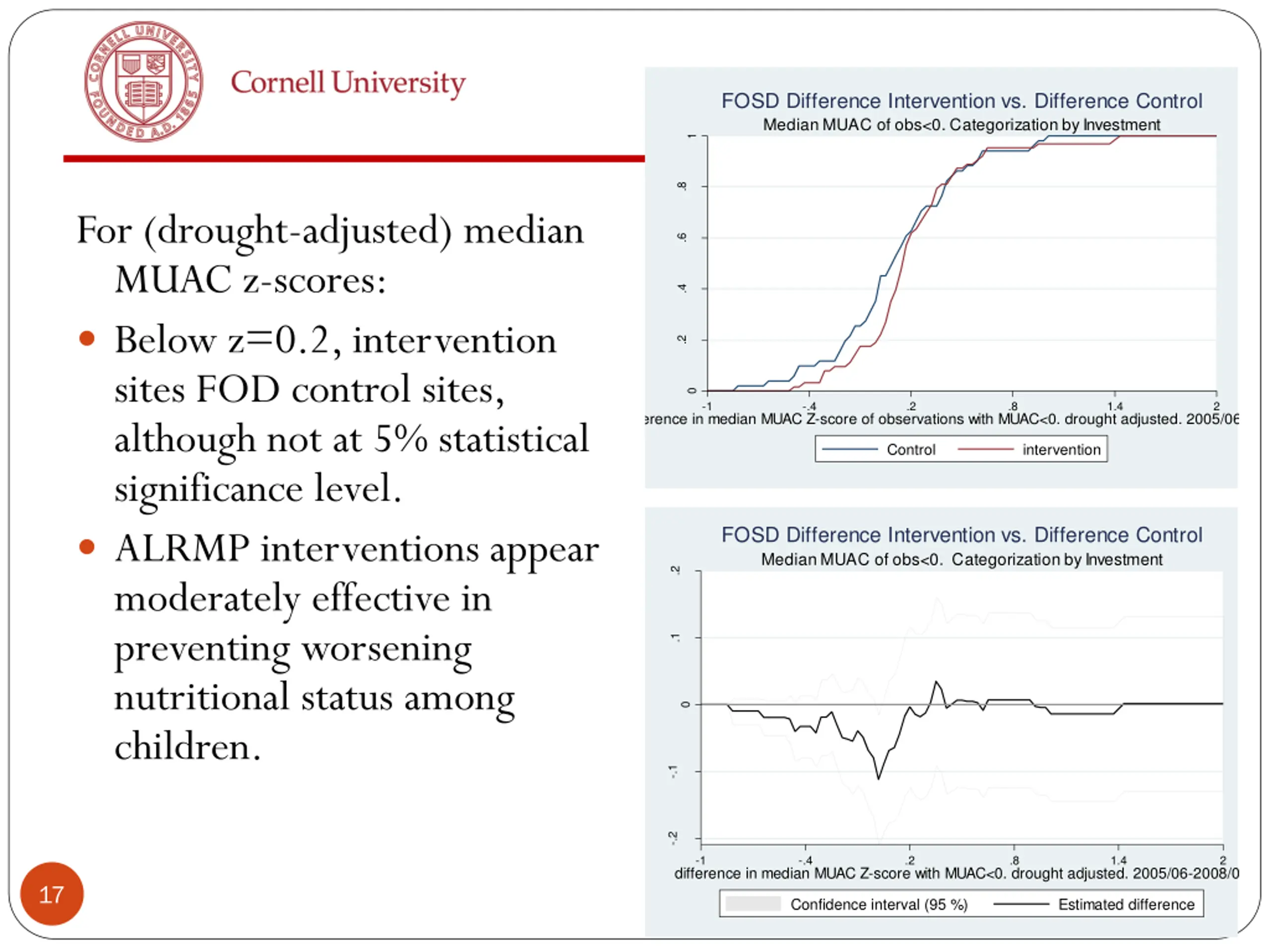 FOSD Difference Intervention vs. Difference Control Median MUAC of obs<0. Categorization by Investment 1 .8 For (drought-adjusted) median MUAC z-scores: Below z=0.2, intervention sites FOD control sites, although not at 5% statistical significance level. ALRMP interventions appear moderately effective in preventing worsening nutritional status among children. % of sublocations .6 .4 .2 0 -1 -.4 .2 .8 1.4 2 difference in median MUAC Z-score of observations with MUAC<0. drought adjusted. 2005/06-2008/09 Control intervention FOSD Difference Intervention vs. Difference Control Median MUAC of obs<0. Categorization by Investment .2 .1 % of sublocations 0 -.1 -.2 -1 -.4 .2 .8 1.4 2 difference in median MUAC Z-score with MUAC<0. drought adjusted. 2005/06-2008/09 17 Confidence interval (95 %) Estimated difference