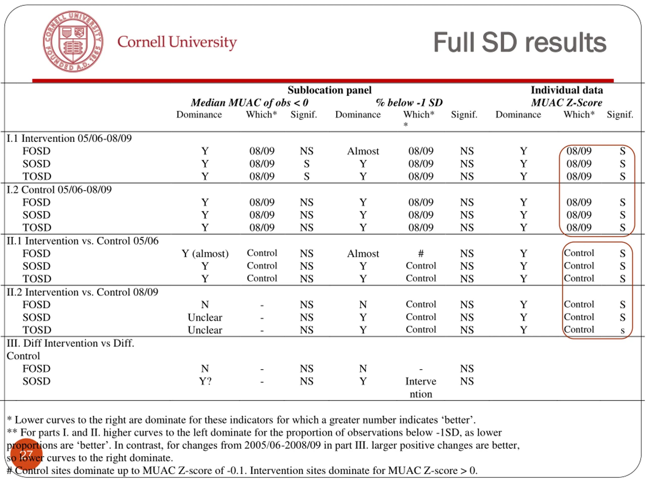 Full SD results Full SD results Sublocation panel Individual data MUAC Z-Score Dominance Median MUAC of obs < 0 Dominance % below -1 SD Which* * Almost Y Y Y Y Y Almost Y Y N Y Y Which* Signif. Dominance Signif. Which* Signif. I.1 Intervention 05/06-08/09 FOSD SOSD TOSD I.2 Control 05/06-08/09 FOSD SOSD TOSD II.1 Intervention vs. Control 05/06 FOSD SOSD TOSD II.2 Intervention vs. Control 08/09 FOSD SOSD TOSD III. Diff Intervention vs Diff. Control FOSD SOSD Y Y Y Y Y Y 08/09 08/09 08/09 08/09 08/09 08/09 Control Control Control - - - NS S S NS NS NS NS NS NS NS NS NS 08/09 08/09 08/09 08/09 08/09 08/09 # Control Control Control Control Control NS NS NS Y Y Y Y Y Y Y Y Y Y Y Y 08/09 08/09 08/09 08/09 08/09 08/09 Control Control Control Control Control Control S S S S S S S S S S S s NS NS NS NS NS NS NS NS NS Y (almost) Y Y N Unclear Unclear N Y? - - NS NS N Y - NS NS Interve ntion * Lower curves to the right are dominate for these indicators for which a greater number indicates better . ** For parts I. and II. higher curves to the left dominate for the proportion of observations below -1SD, as lower proportions are better . In contrast, for changes from 2005/06-2008/09 in part III. larger positive changes are better, so lower curves to the right dominate. # Control sites dominate up to MUAC Z-score of -0.1. Intervention sites dominate for MUAC Z-score > 0. 27