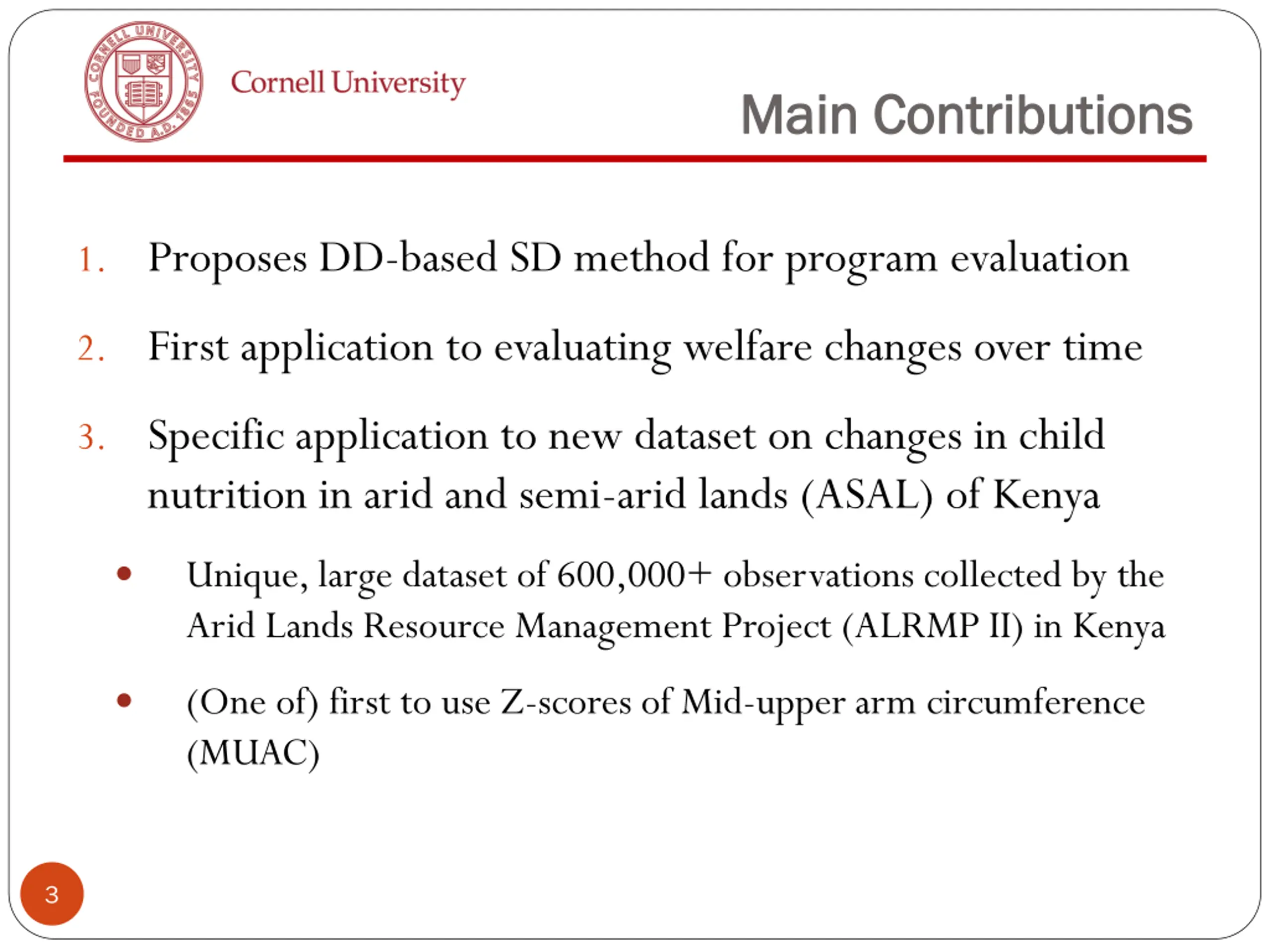 Main Contributions Main Contributions 1. Proposes DD-based SD method for program evaluation 2. First application to evaluating welfare changes over time 3. Specific application to new dataset on changes in child nutrition in arid and semi-arid lands (ASAL) of Kenya Unique, large dataset of 600,000+ observations collected by the Arid Lands Resource Management Project (ALRMP II) in Kenya (One of) first to use Z-scores of Mid-upper arm circumference (MUAC) 3