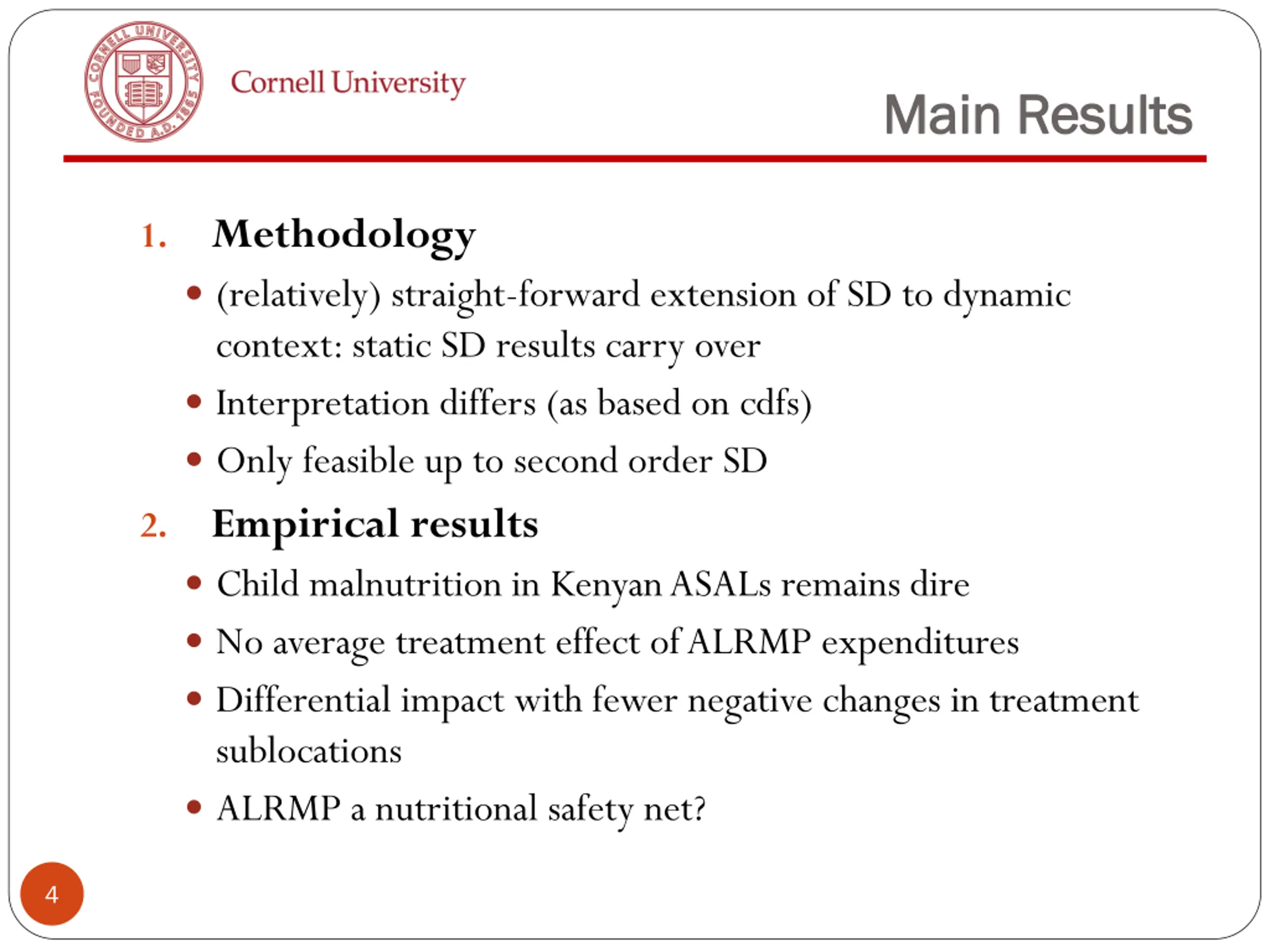 Main Results Main Results Methodology (relatively) straight-forward extension of SD to dynamic context: static SD results carry over Interpretation differs (as based on cdfs) Only feasible up to second order SD Empirical results Child malnutrition in Kenyan ASALs remains dire No average treatment effect of ALRMP expenditures Differential impact with fewer negative changes in treatment sublocations ALRMP a nutritional safety net? 1. 2. 4