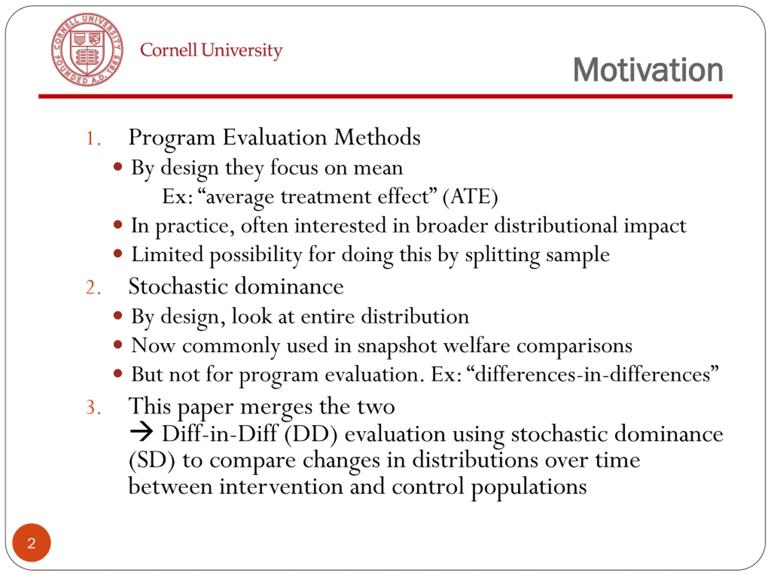 Motivation Motivation Program Evaluation Methods By design they focus on mean Ex: average treatment effect (ATE) In practice, often interested in broader distributional impact Limited possibility for doing this by splitting sample Stochastic dominance By design, look at entire distribution Now commonly used in snapshot welfare comparisons But not for program evaluation. Ex: differences-in-differences This paper merges the two Diff-in-Diff (DD) evaluation using stochastic dominance (SD) to compare changes in distributions over time between intervention and control populations 1. 2. 3. 2
