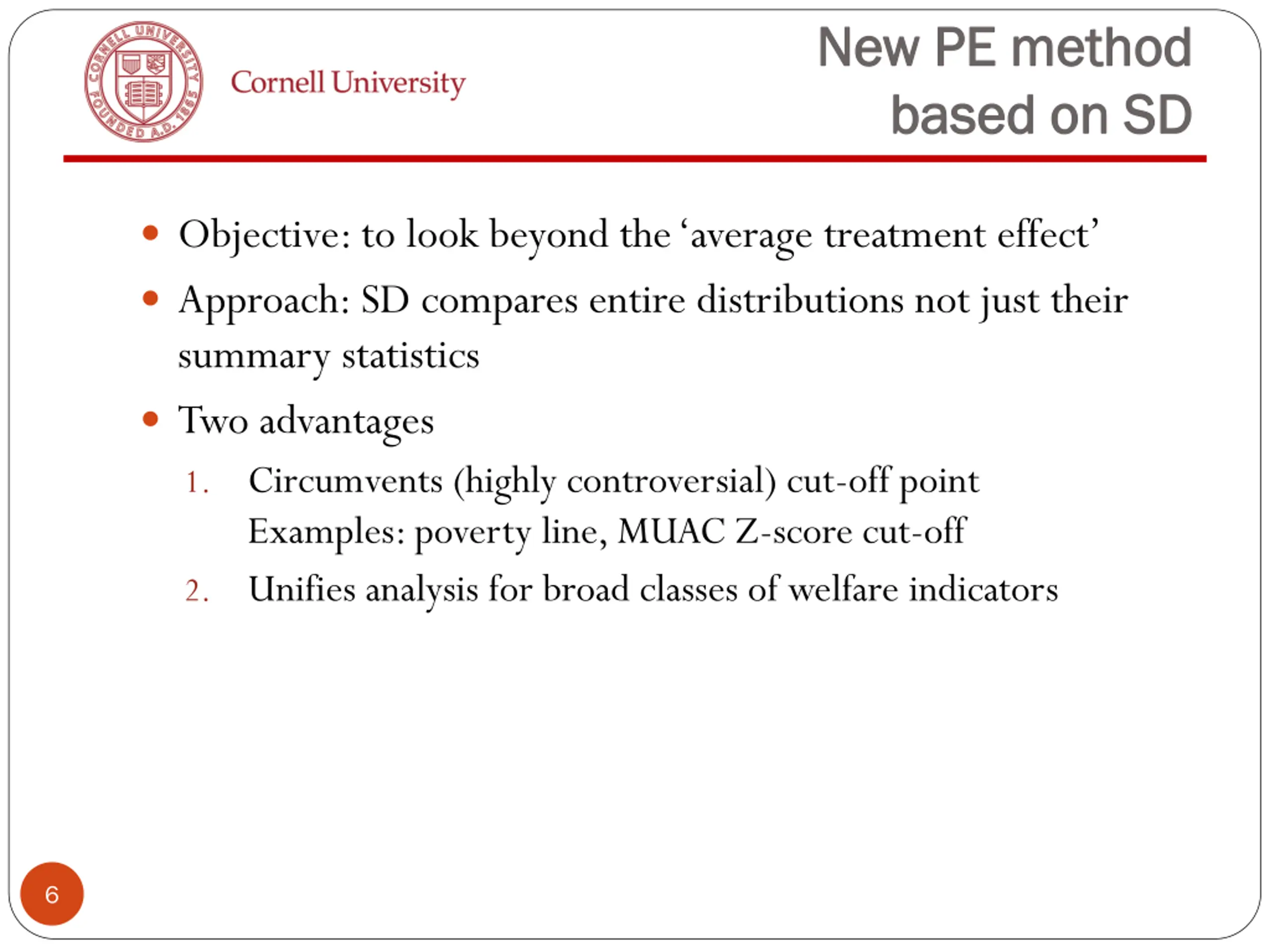 New PE method New PE method based on SD based on SD Objective: to look beyond the average treatment effect Approach: SD compares entire distributions not just their summary statistics Two advantages 1. Circumvents (highly controversial) cut-off point Examples: poverty line, MUAC Z-score cut-off 2. Unifies analysis for broad classes of welfare indicators 6