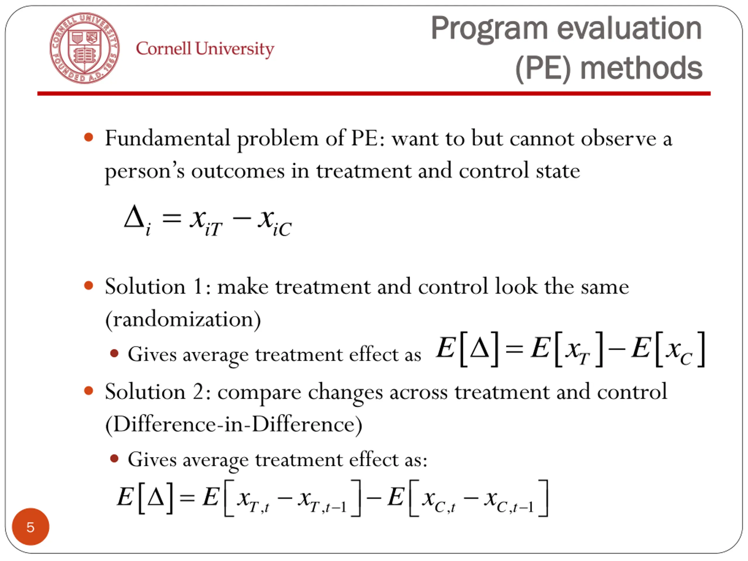 Program evaluation Program evaluation (PE) methods (PE) methods Fundamental problem of PE: want to but cannot observe a person s outcomes in treatment and control state x x = i iT iC Solution 1: make treatment and control look the same (randomization) Gives average treatment effect as Solution 2: compare changes across treatment and control (Difference-in-Difference) Gives average treatment effect as: , , 1 T t T t E E x x = = T E x C E x E E x x , , 1 C t C t 5