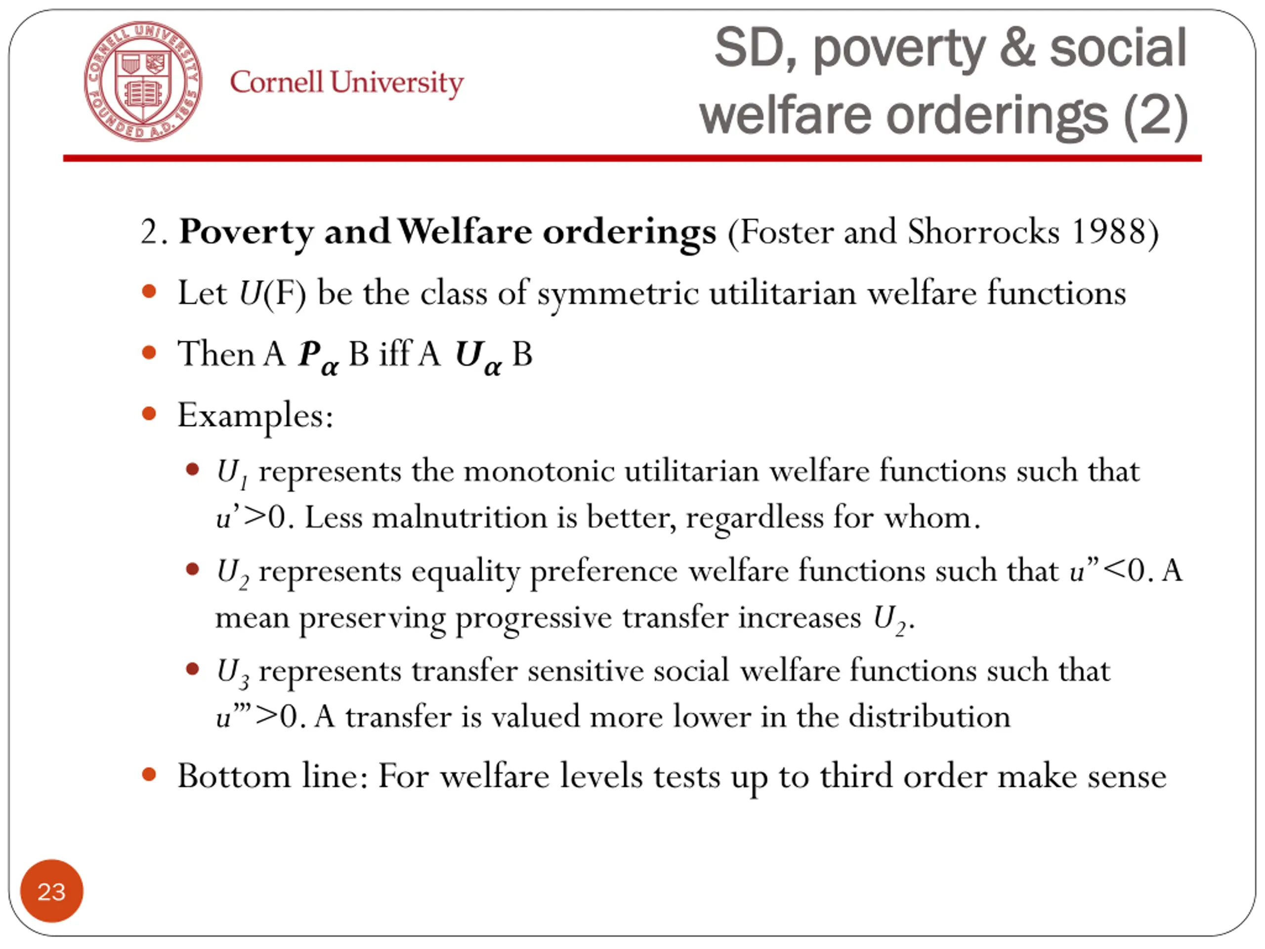 SD, poverty & social SD, poverty & social welfare orderings (2) welfare orderings (2) 2. Poverty and Welfare orderings (Foster and Shorrocks 1988) Let U(F) be the class of symmetric utilitarian welfare functions Then A P B iff A U B Examples: U1 represents the monotonic utilitarian welfare functions such that u >0. Less malnutrition is better, regardless for whom. U2 represents equality preference welfare functions such that u <0. A mean preserving progressive transfer increases U2. U3 represents transfer sensitive social welfare functions such that u >0. A transfer is valued more lower in the distribution Bottom line: For welfare levels tests up to third order make sense 23