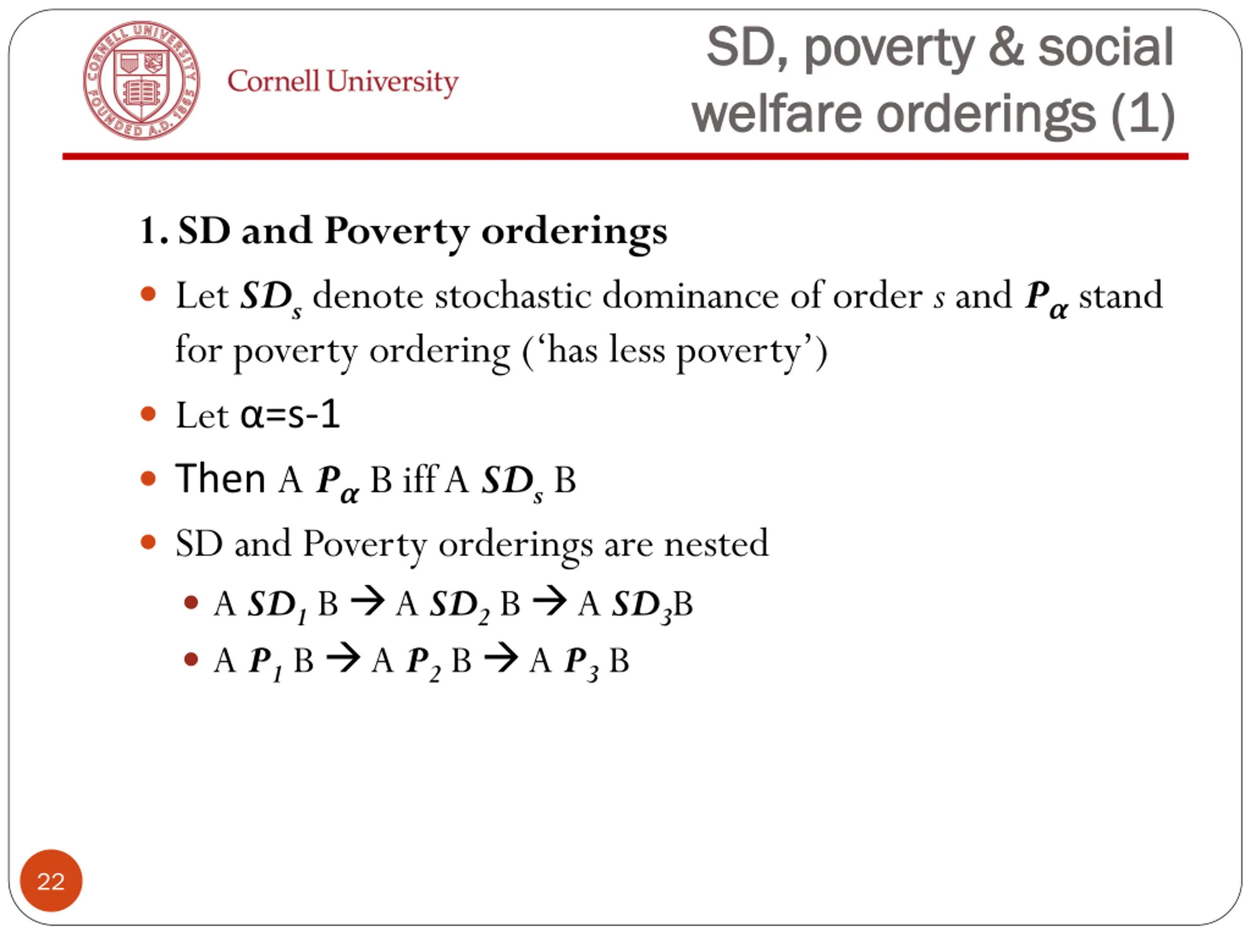 SD, poverty & social SD, poverty & social welfare orderings (1) welfare orderings (1) 1. SD and Poverty orderings Let SDs denote stochastic dominance of order s and P stand for poverty ordering ( has less poverty ) Let =s-1 Then A P B iff A SDs B SD and Poverty orderings are nested A SD1 B A SD2 B A SD3B A P1 B A P2 B A P3 B 22
