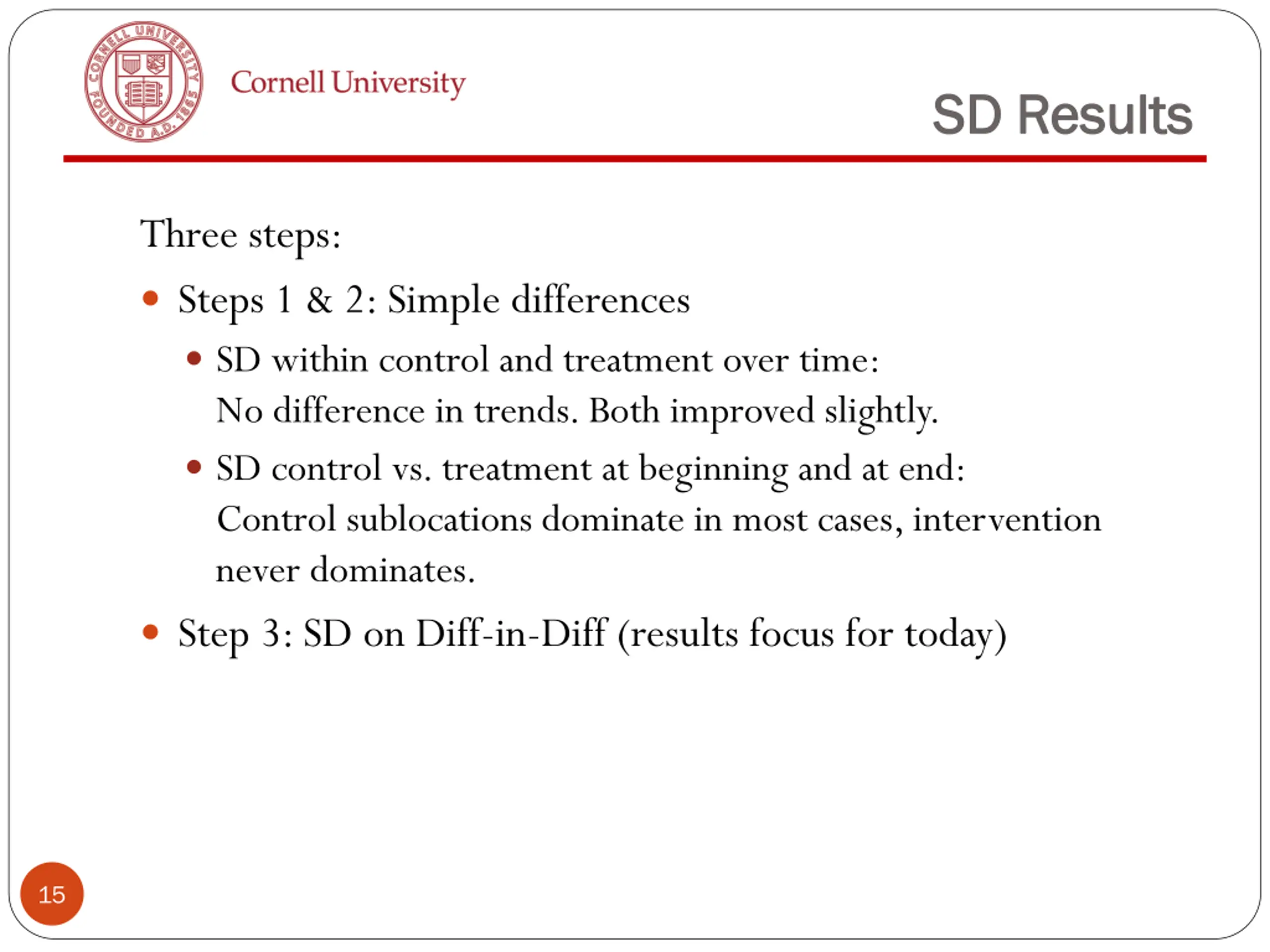 SD Results SD Results Three steps: Steps 1 & 2: Simple differences SD within control and treatment over time: No difference in trends. Both improved slightly. SD control vs. treatment at beginning and at end: Control sublocations dominate in most cases, intervention never dominates. Step 3: SD on Diff-in-Diff (results focus for today) 15