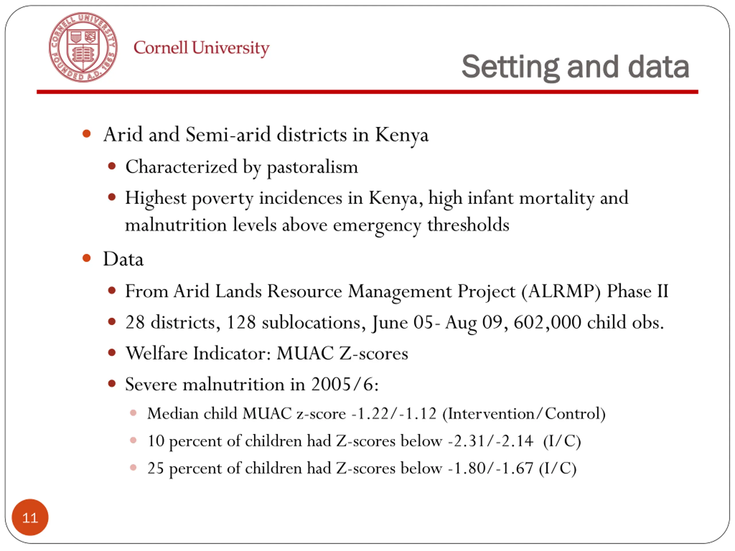 Setting and data Setting and data Arid and Semi-arid districts in Kenya Characterized by pastoralism Highest poverty incidences in Kenya, high infant mortality and malnutrition levels above emergency thresholds Data From Arid Lands Resource Management Project (ALRMP) Phase II 28 districts, 128 sublocations, June 05- Aug 09, 602,000 child obs. Welfare Indicator: MUAC Z-scores Severe malnutrition in 2005/6: Median child MUAC z-score -1.22/-1.12 (Intervention/Control) 10 percent of children had Z-scores below -2.31/-2.14 (I/C) 25 percent of children had Z-scores below -1.80/-1.67 (I/C) 11