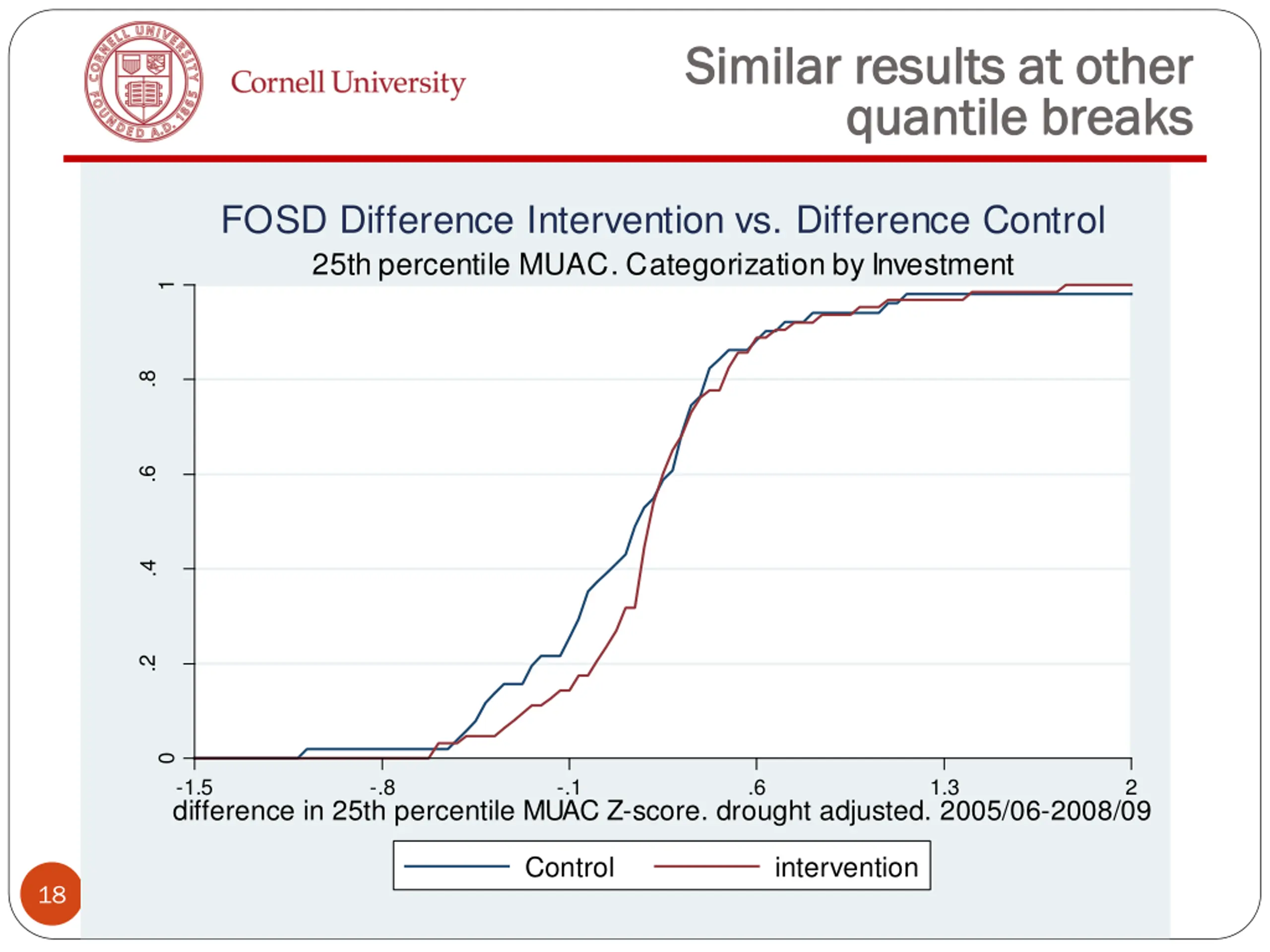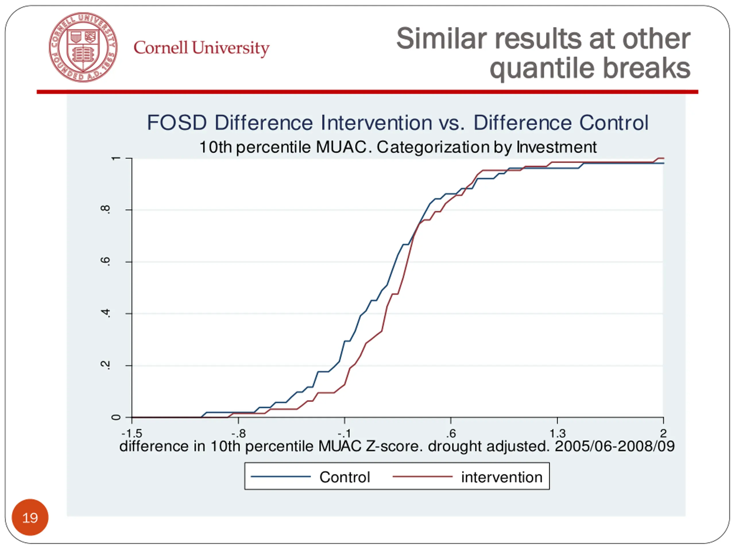 Similar results at other Similar results at other quantile quantile breaks breaks FOSD Difference Intervention vs. Difference Control 25th percentile MUAC. Categorization by Investment 1 .8 % of sublocations .6 .4 .2 0 -1.5 difference in 25th percentile MUAC Z-score. drought adjusted. 2005/06-2008/09 -.8 -.1 .6 1.3 2 Control intervention 18