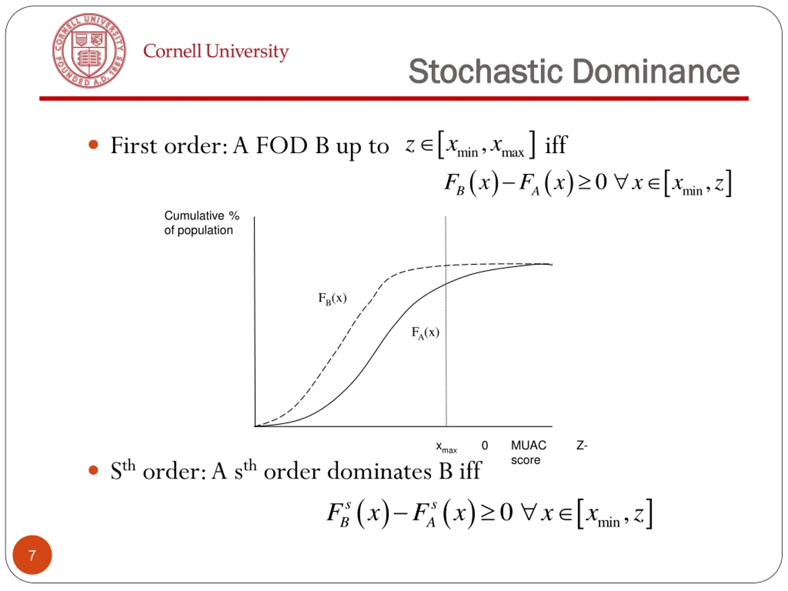 Stochastic Dominance Stochastic Dominance iff max , x ( ) F x z min x First order: A FOD B up to ( ) 0 , F x x min x z B A Cumulative % of population FB(x) FA(x) xmax 0 MUAC score Z- Sth order: A sth order dominates B iff ( ) x ( ) x s s 0 , F F x min x z B A 7