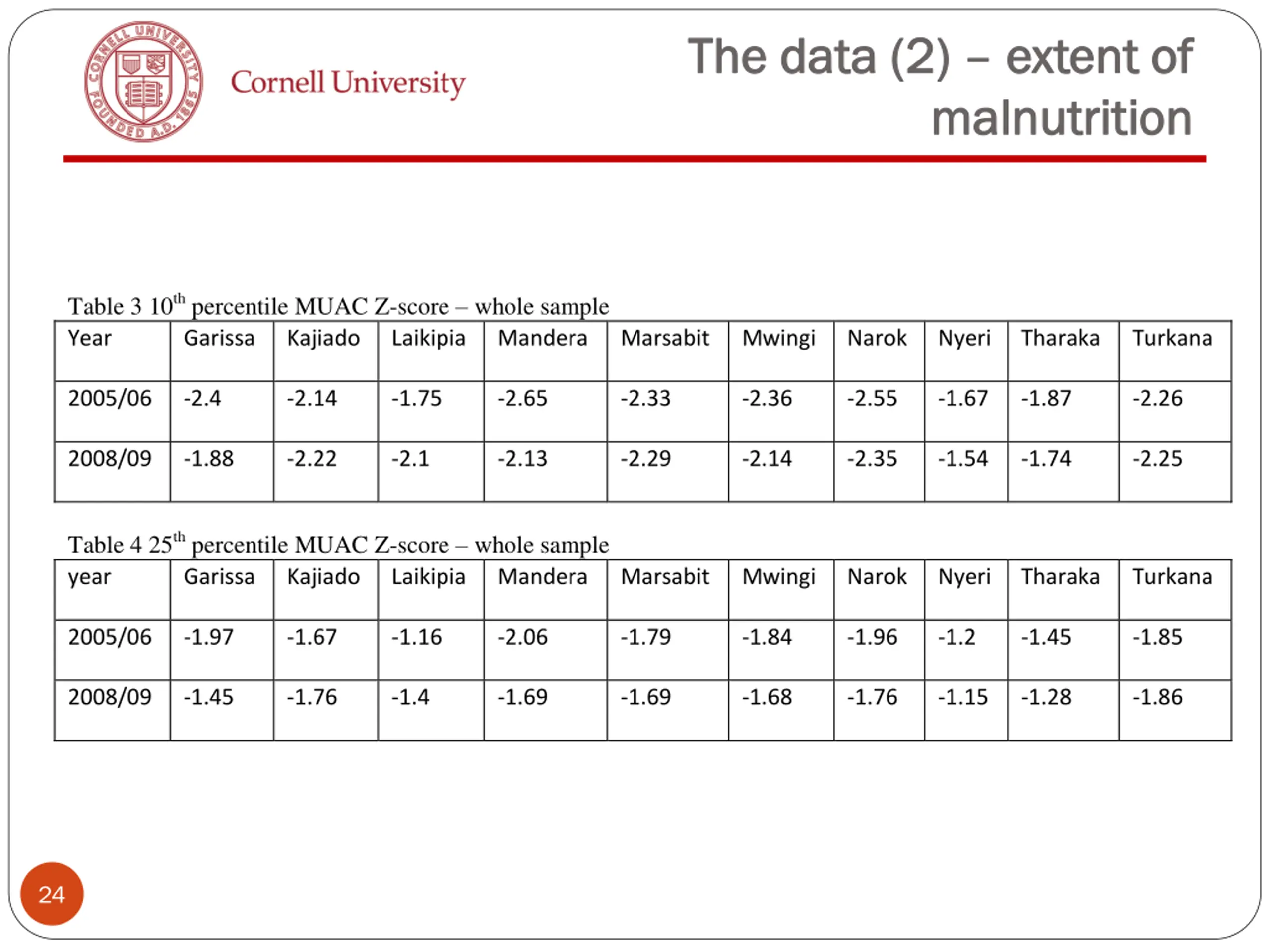 The data (2) The data (2) extent of malnutrition malnutrition extent of Table 3 10th percentile MUAC Z-score whole sample Year Garissa Kajiado Laikipia Mandera Marsabit Mwingi Narok Nyeri Tharaka Turkana 2005/06 -2.4 -2.14 -1.75 -2.65 -2.33 -2.36 -2.55 -1.67 -1.87 -2.26 2008/09 -1.88 -2.22 -2.1 -2.13 -2.29 -2.14 -2.35 -1.54 -1.74 -2.25 Table 4 25th percentile MUAC Z-score whole sample year Garissa Kajiado Laikipia Mandera Marsabit Mwingi Narok Nyeri Tharaka Turkana 2005/06 -1.97 -1.67 -1.16 -2.06 -1.79 -1.84 -1.96 -1.2 -1.45 -1.85 2008/09 -1.45 -1.76 -1.4 -1.69 -1.69 -1.68 -1.76 -1.15 -1.28 -1.86 24