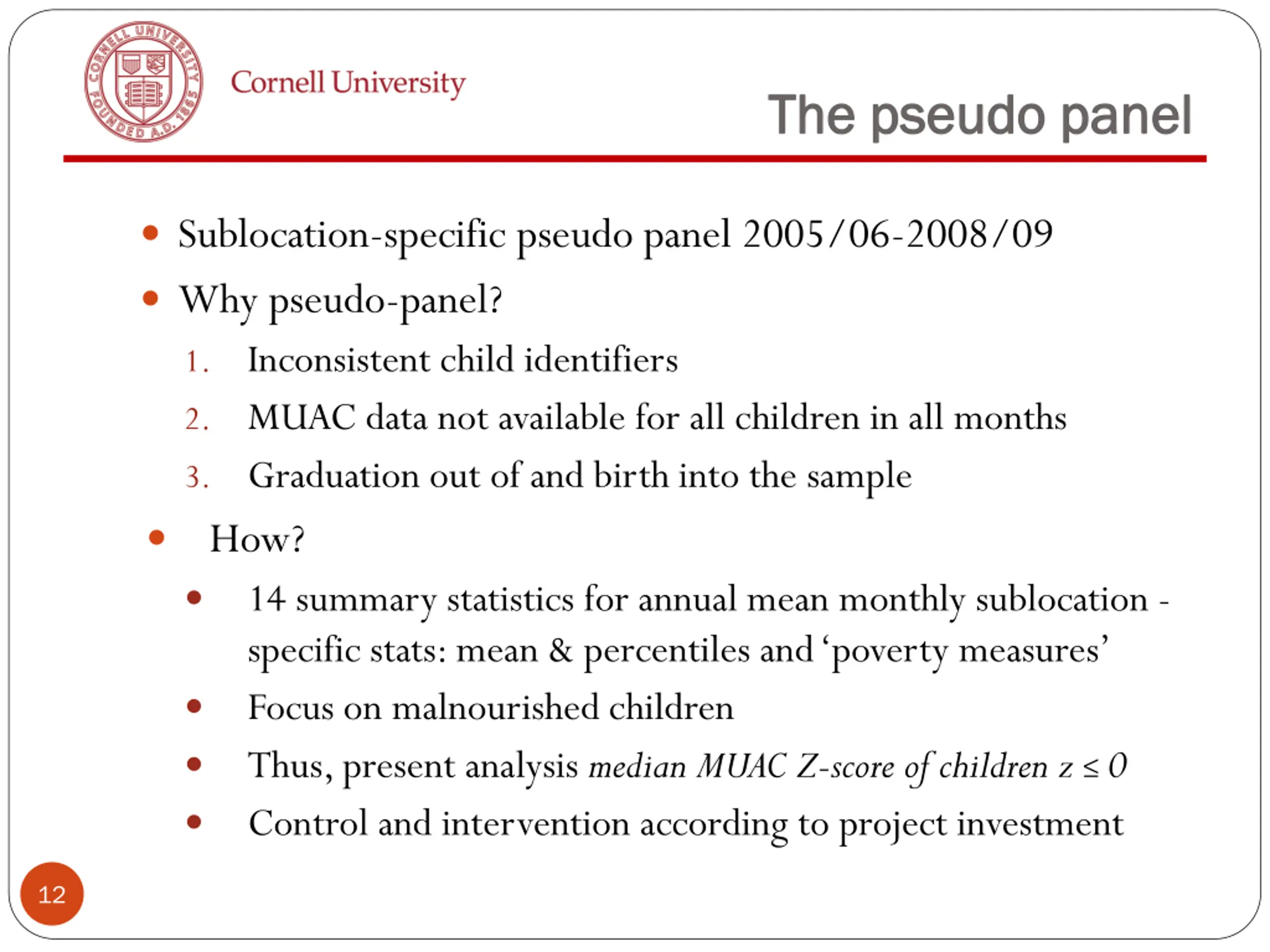 The pseudo panel The pseudo panel Sublocation-specific pseudo panel 2005/06-2008/09 Why pseudo-panel? 1. Inconsistent child identifiers 2. MUAC data not available for all children in all months 3. Graduation out of and birth into the sample How? 14 summary statistics for annual mean monthly sublocation - specific stats: mean & percentiles and poverty measures Focus on malnourished children Thus, present analysis median MUAC Z-score of children z 0 Control and intervention according to project investment 12