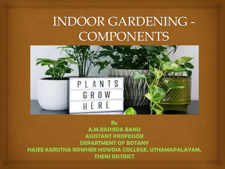 INDOOR GARDENING - COMPONENTS By A.M.RASHIDA BANU ASSISTANT PROFESSOR DEPARTMENT OF BOTANY HAJEE KARUTHA ROWHER HOWDIA COLLEGE, UTHAMAPALAYAM, THENI DISTRICT