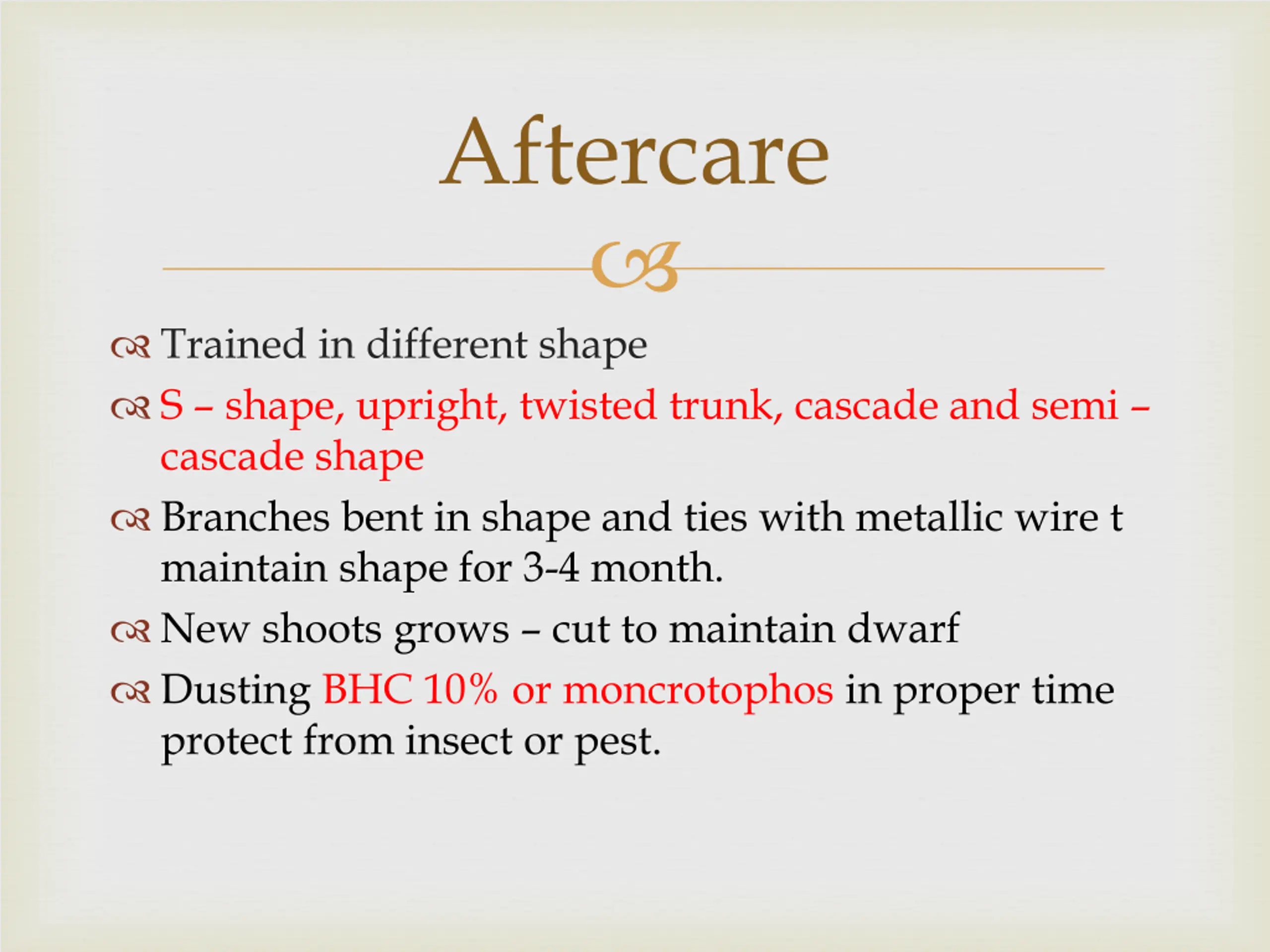 Aftercare Trained in different shape S shape, upright, twisted trunk, cascade and semi cascade shape Branches bent in shape and ties with metallic wire t maintain shape for 3-4 month. New shoots grows cut to maintain dwarf Dusting BHC 10% or moncrotophos in proper time protect from insect or pest.