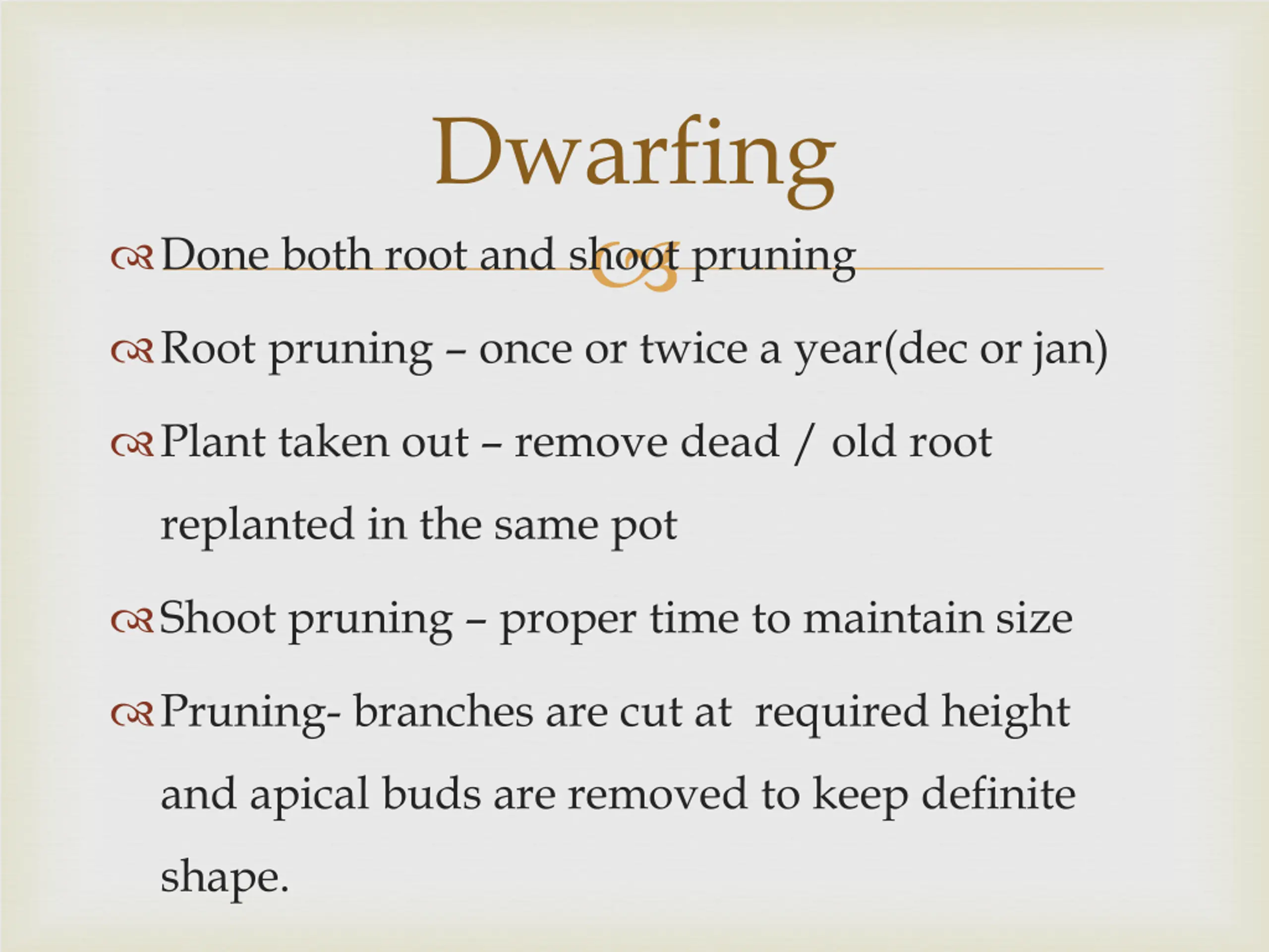 Dwarfing Done both root and shoot pruning Root pruning once or twice a year(dec or jan) Plant taken out remove dead / old root replanted in the same pot Shoot pruning proper time to maintain size Pruning- branches are cut at required height and apical buds are removed to keep definite shape.