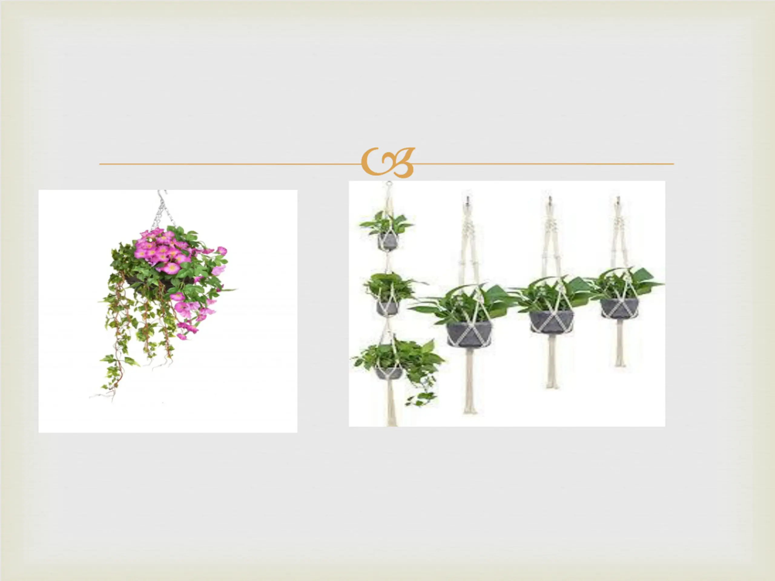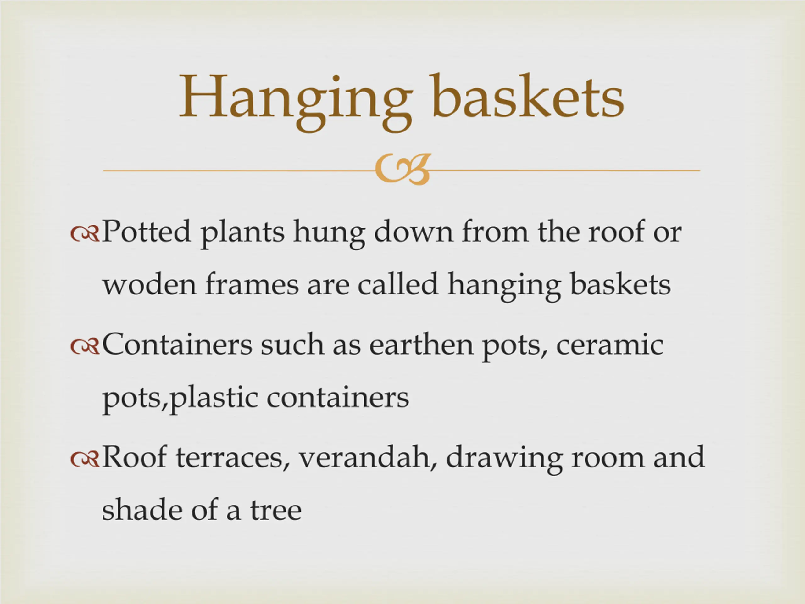 Hanging baskets Potted plants hung down from the roof or woden frames are called hanging baskets Containers such as earthen pots, ceramic pots,plastic containers Roof terraces, verandah, drawing room and shade of a tree