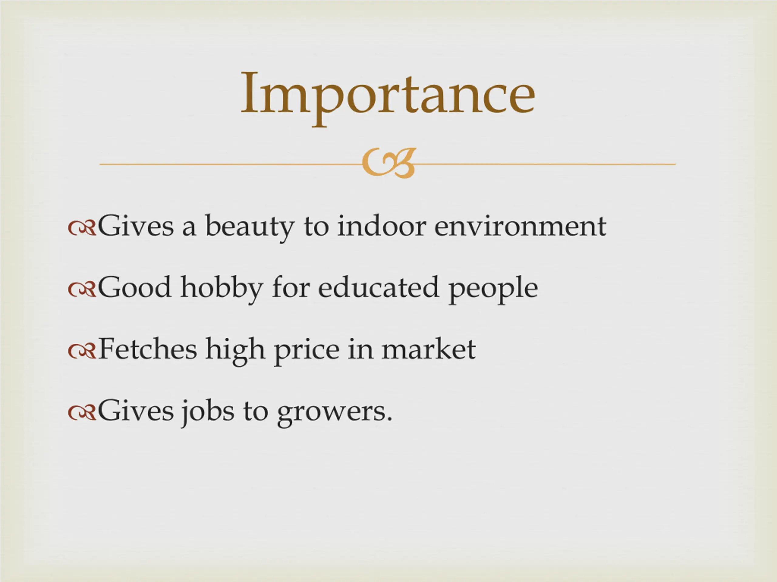 Importance Gives a beauty to indoor environment Good hobby for educated people Fetches high price in market Gives jobs to growers.
