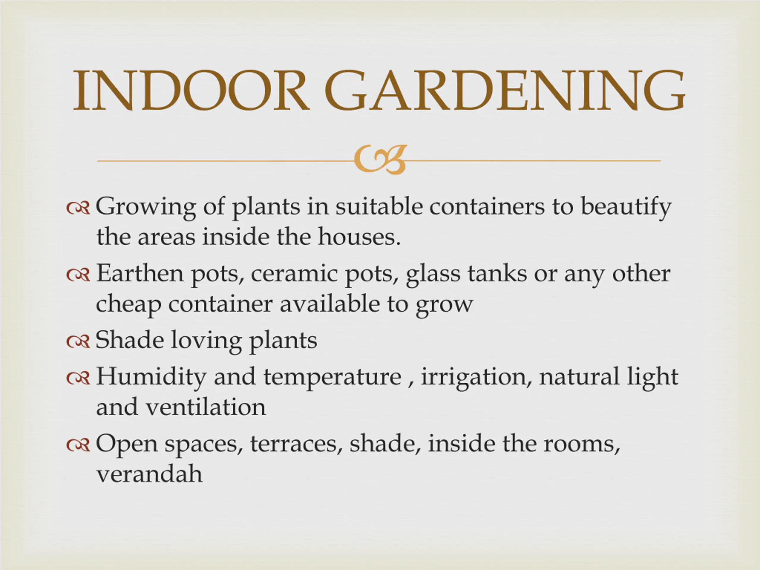 INDOOR GARDENING Growing of plants in suitable containers to beautify the areas inside the houses. Earthen pots, ceramic pots, glass tanks or any other cheap container available to grow Shade loving plants Humidity and temperature , irrigation, natural light and ventilation Open spaces, terraces, shade, inside the rooms, verandah