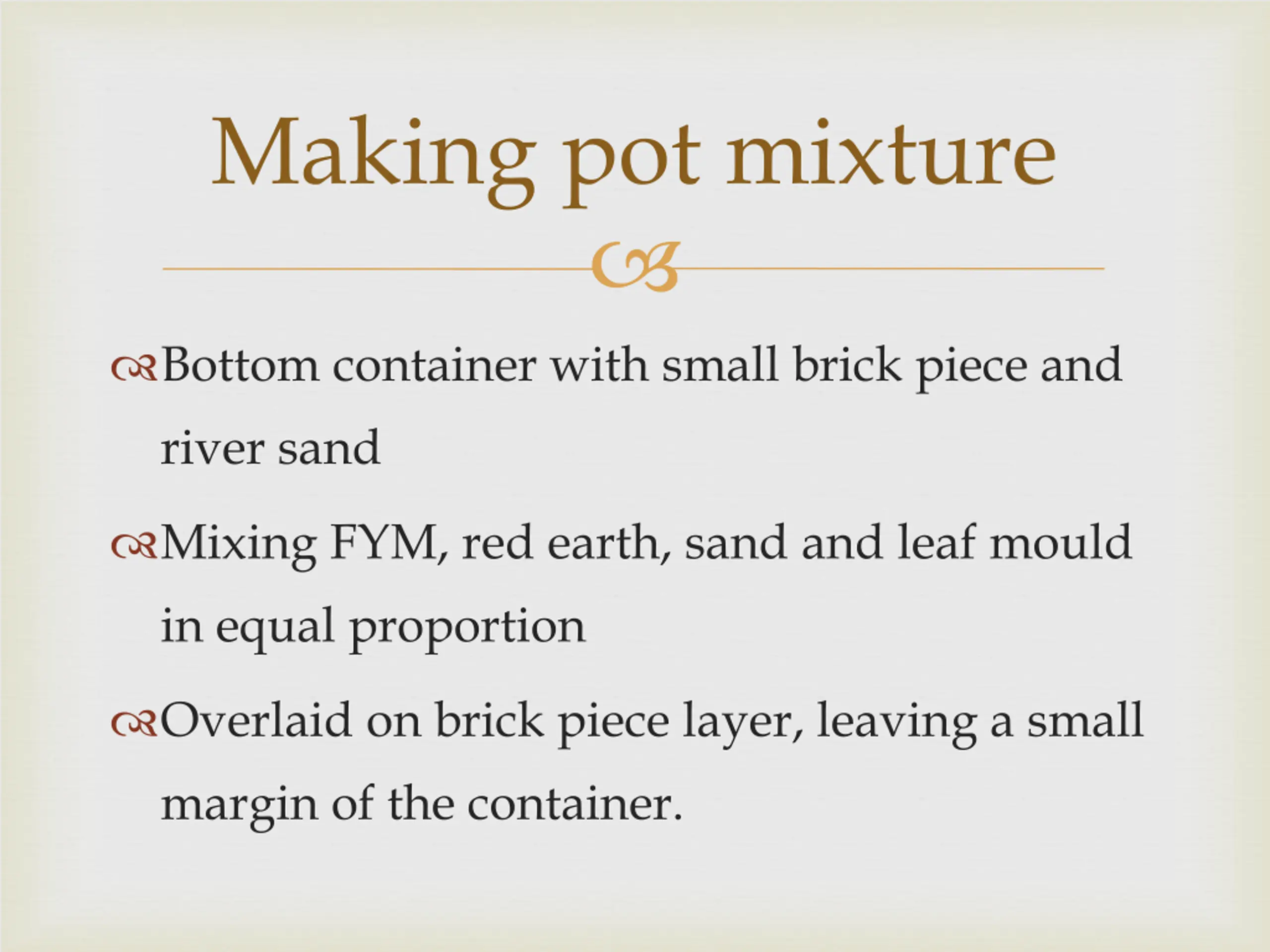 Making pot mixture Bottom container with small brick piece and river sand Mixing FYM, red earth, sand and leaf mould in equal proportion Overlaid on brick piece layer, leaving a small margin of the container.