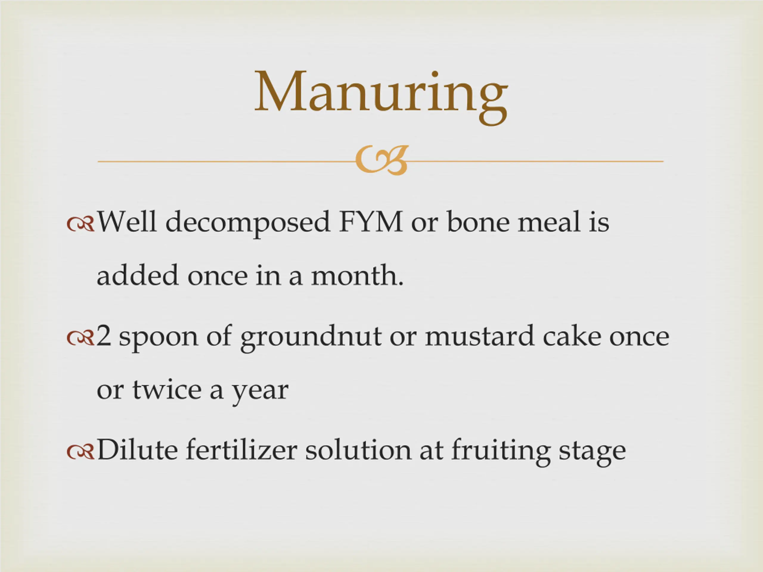 Manuring Well decomposed FYM or bone meal is added once in a month. 2 spoon of groundnut or mustard cake once or twice a year Dilute fertilizer solution at fruiting stage