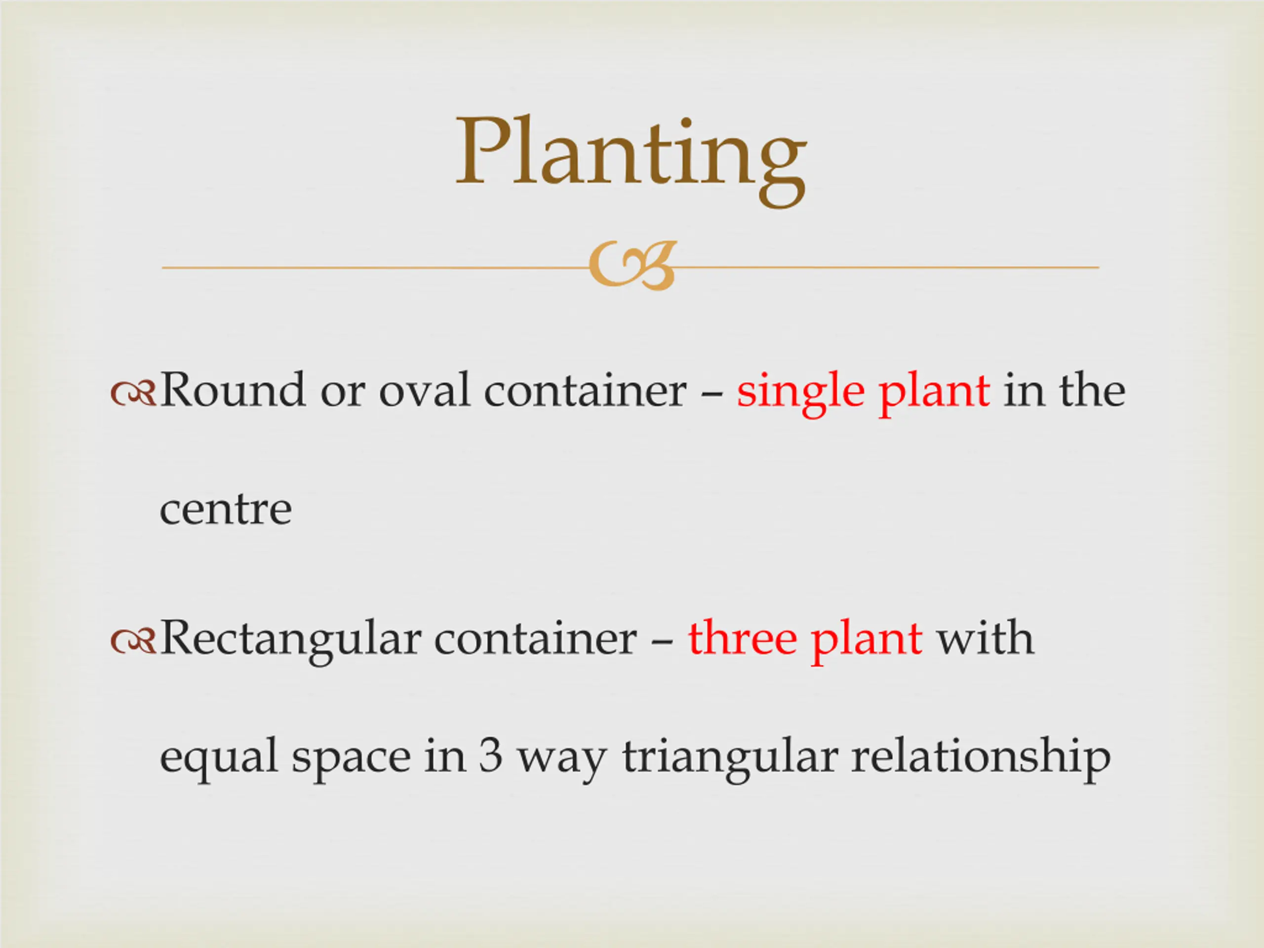 Planting Round or oval container single plant in the centre Rectangular container three plant with equal space in 3 way triangular relationship
